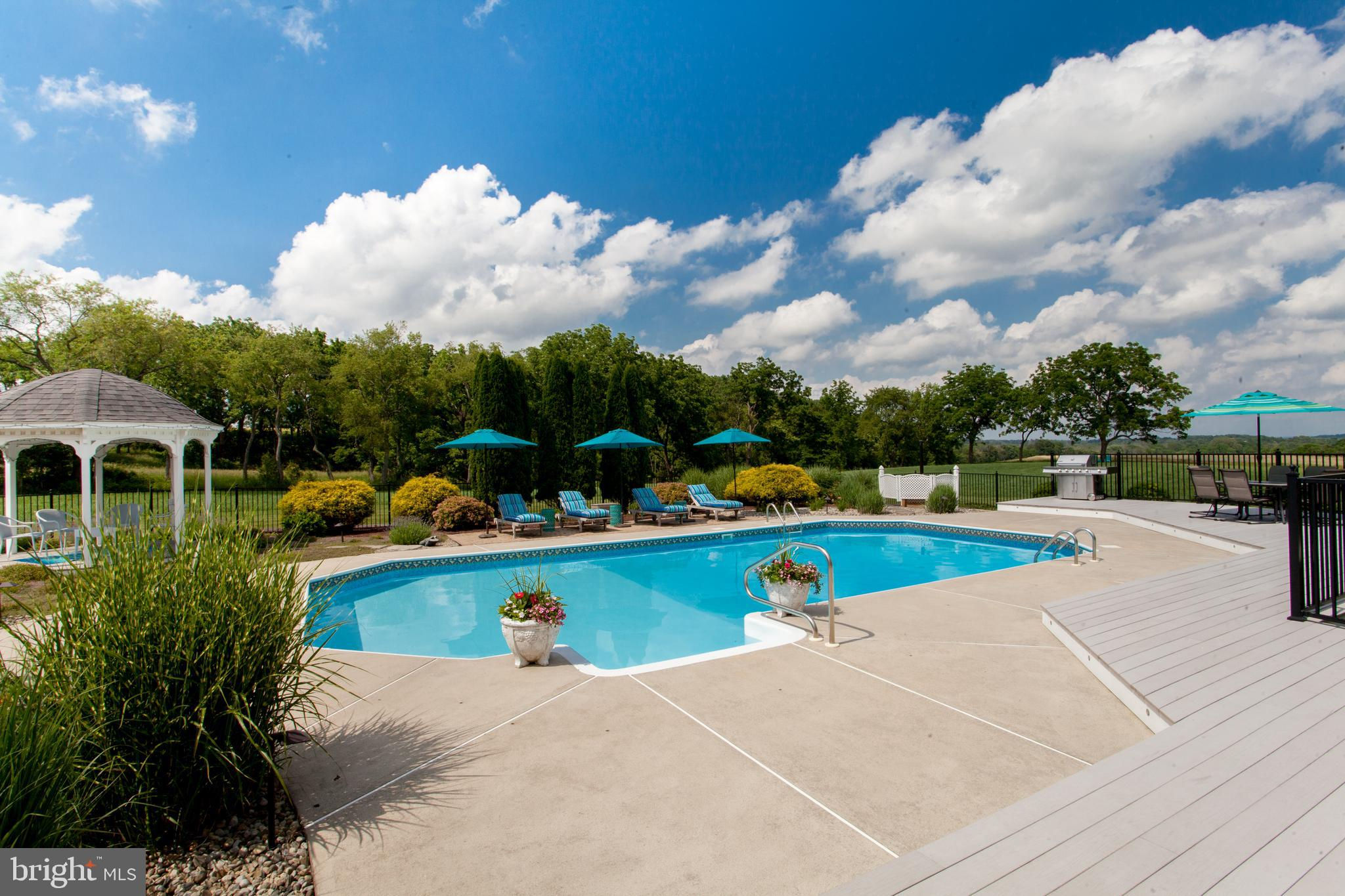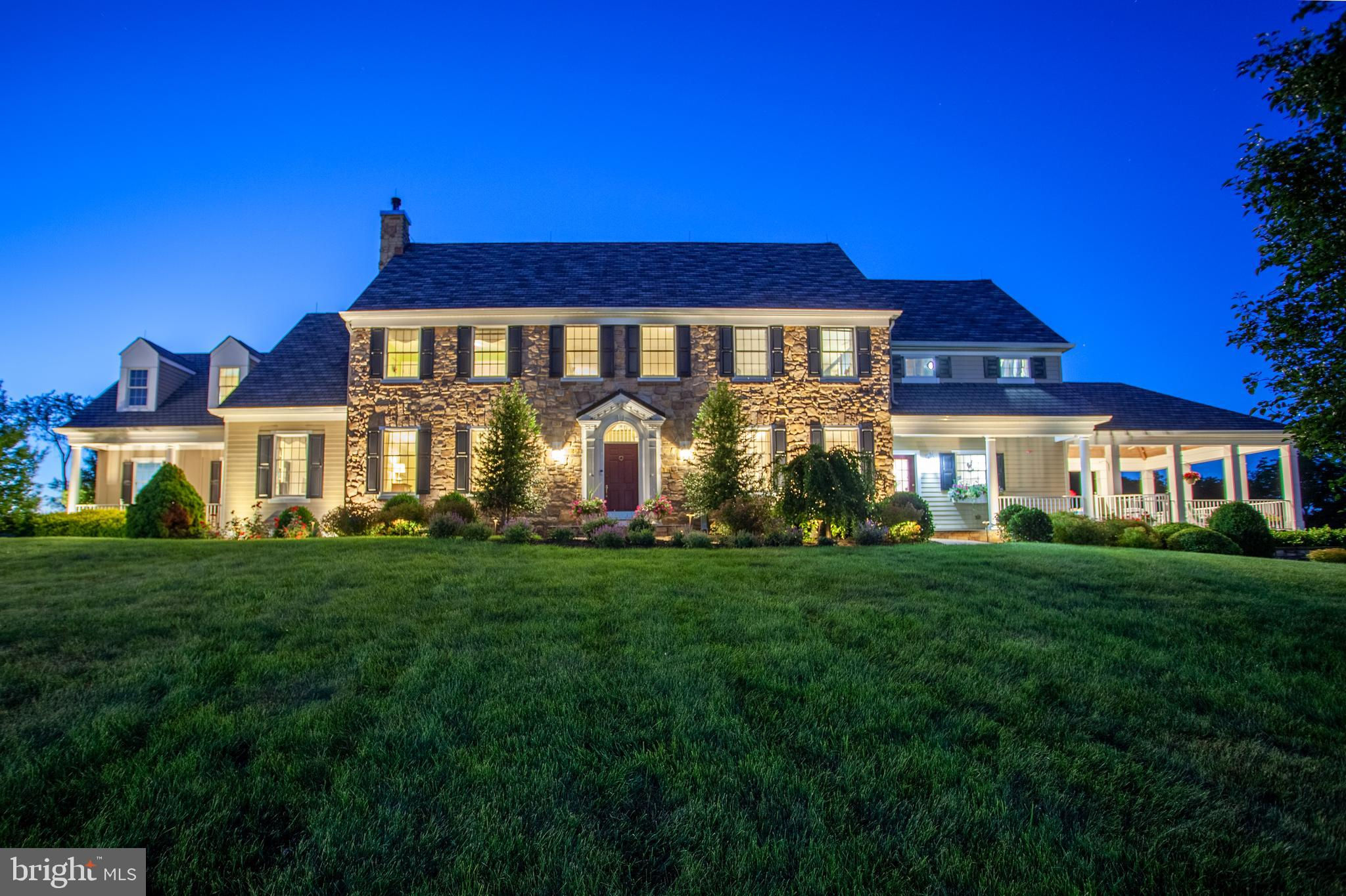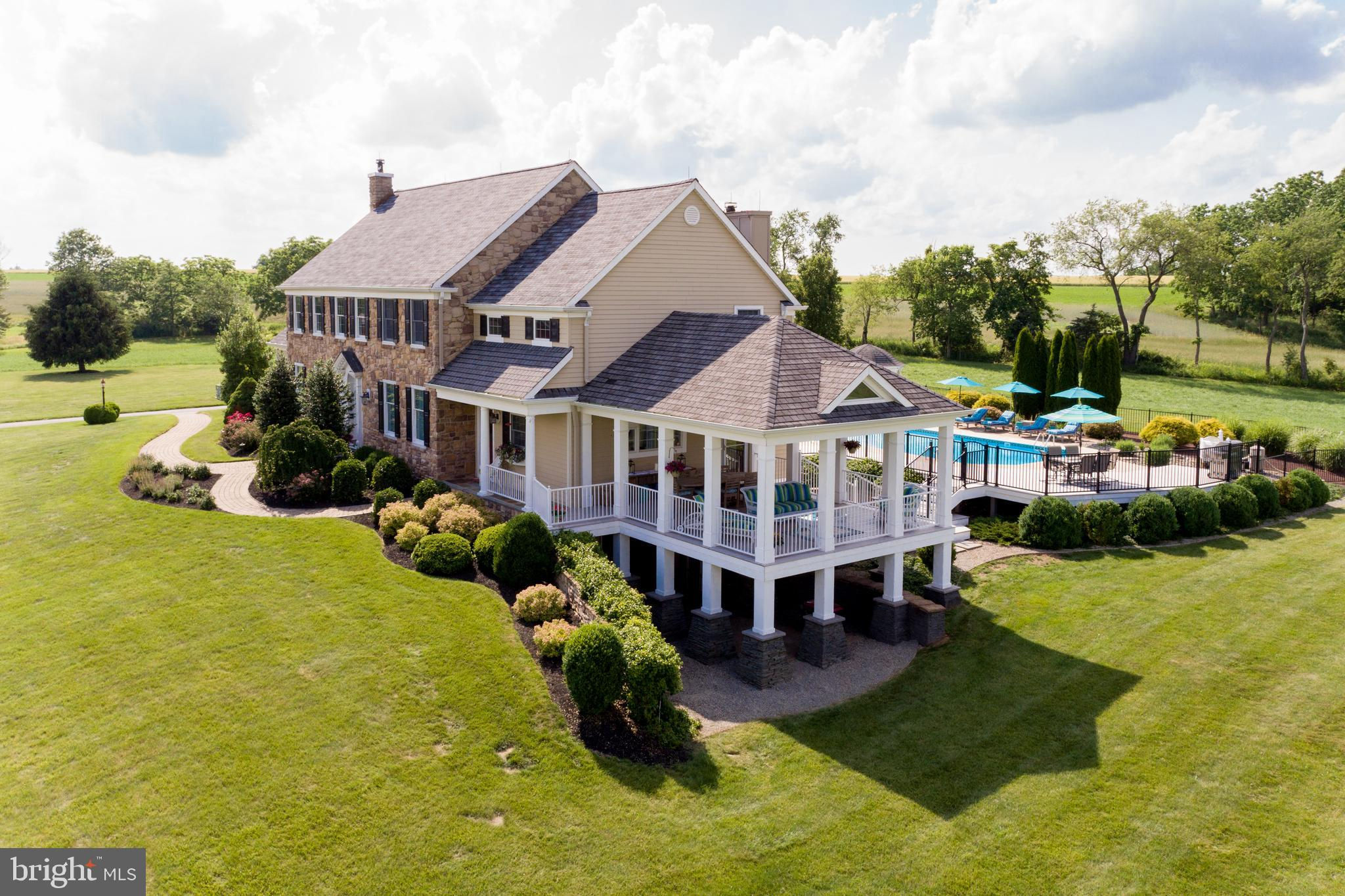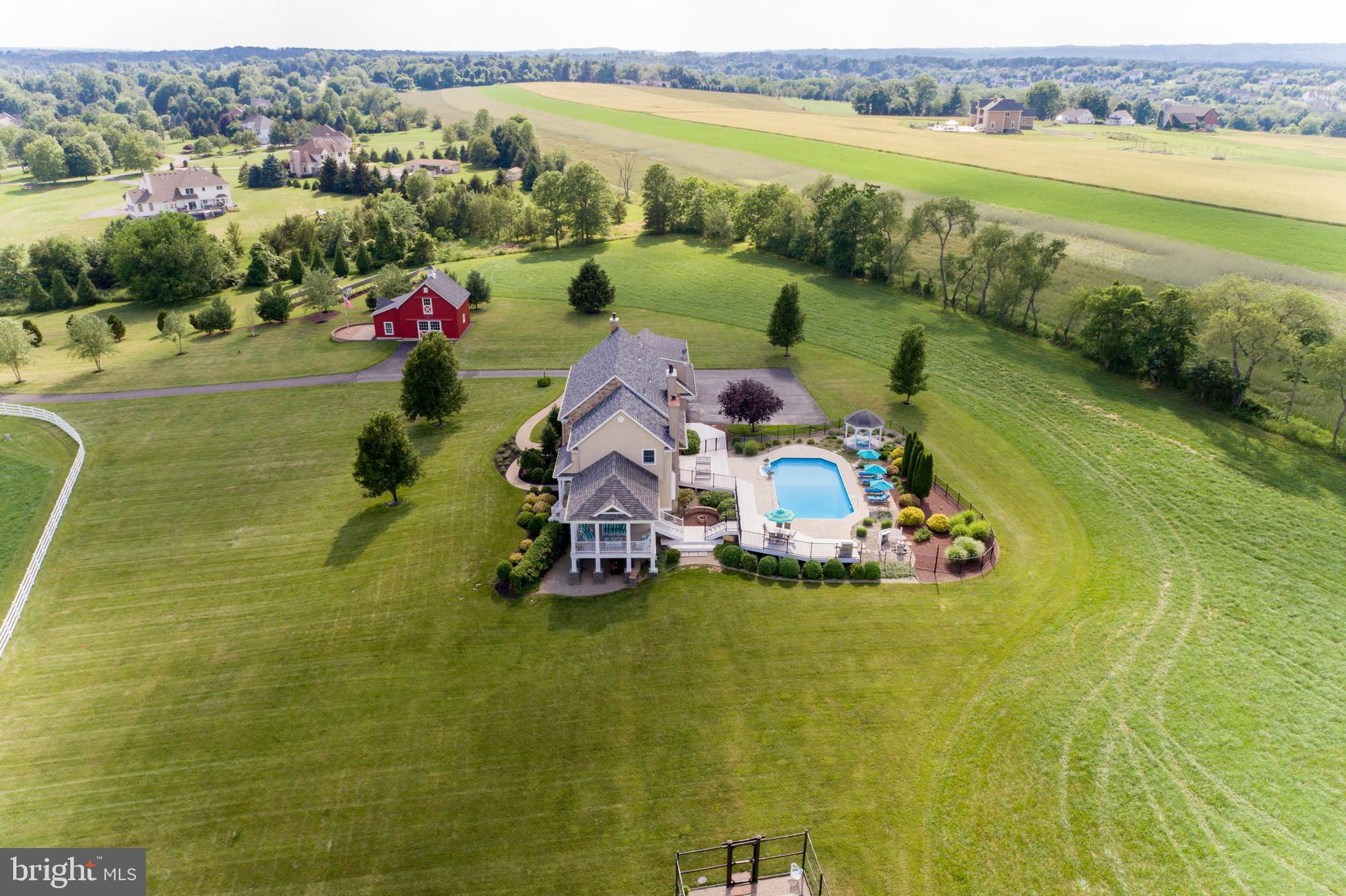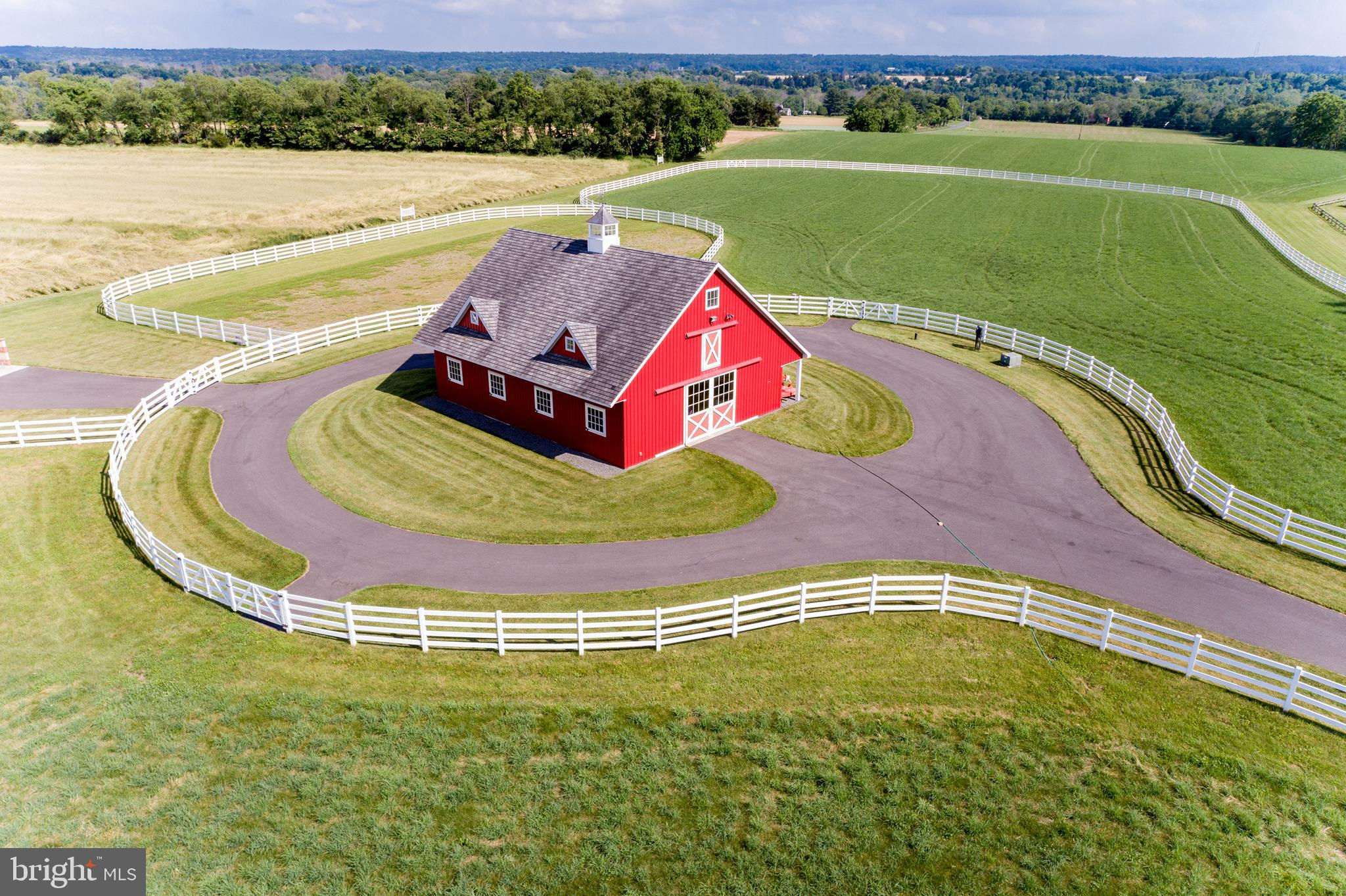 Chestnut Hill Farm is a spectacular property offering a gorgeous custom home, 2 barns, and stunning long-distance views. Sited on 26 acres, and surrounded by over 300 acres of preserved farmland, the driveway leads to a beautiful center hall colonial farmhouse. Enter into the 2-story foyer and notice the custom mill work, pine floors, high-end finishes that extend throughout the home. To the left a large sitting room leads to a home office with private entry. The dining room is framed by architectural pillars and flows into the sunny living room with fireplace surrounded, built-ins and full height windows. The eat-in-kitchen is a chef’s delight and features it's own fireplace, stainless steel appliances including a 6-burner Viking range, a second oven, granite counters, tile backsplash, center island, and access out to the expansive covered porch with vaulted ceiling overlooking sweeping views of the surrounding countryside and rolling hills. This is the perfect spot to enjoy your morning coffee, feel the breeze, and observe the local wildlife. The first floor is completed by a mudroom/ laundry room, powder room and access to the 3-car attached garage. Heading upstairs to the private living quarters there is a large sun-filled landing with window seat . The primary bedroom suite offers a sunny bedroom, ensuite bathroom with freestanding claw-foot tub, double vanity, tiled shower, and a separate dressing / sitting room with fireplace, two walk-in closets, and a second set of stairs that lead down, offering convenient access to the kitchen and porch. Three additional bedrooms with large closets, including additional ensuite, and a full hall bathroom with double vanity complete this level. The walk-out basement with bar and wood burning fireplace is perfect for entertaining and use as additional office space , with double french doors leading outside. Spend your summer sitting beside the beautifully landscaped in-ground pool and gazebo and enjoy stunning sunsets as you dine al fresco. In winter , warm up by the fire-pit after a cross-country ski from your own property. A barn with loft and heated workshop are nearby and add to the charm and amenities. Follow the tree lined driveway toward the quintessential red and white iconic horse barn built by B&D builders. These respected Amish craftsmen have included everything you need to fulfill your country dreams of keeping horses or sheep, collecting antique cars, or having a fabulous place to throw parties! With 2 solar panel arrays both the house and barn have $0 electric bills! The property is situated directly adjacent to the Amwell Valley Trail System, offering direct access to 30+ miles of trails for biking, hiking, horseback riding, and cross-country skiing. Enjoy the best of country living from this stunning estate located 15 minutes to New Hope, Lambertville, and Flemington and an hour from NYC and Philadelphia $0 Utility Bills!!! Home and Barn completely run on solar.