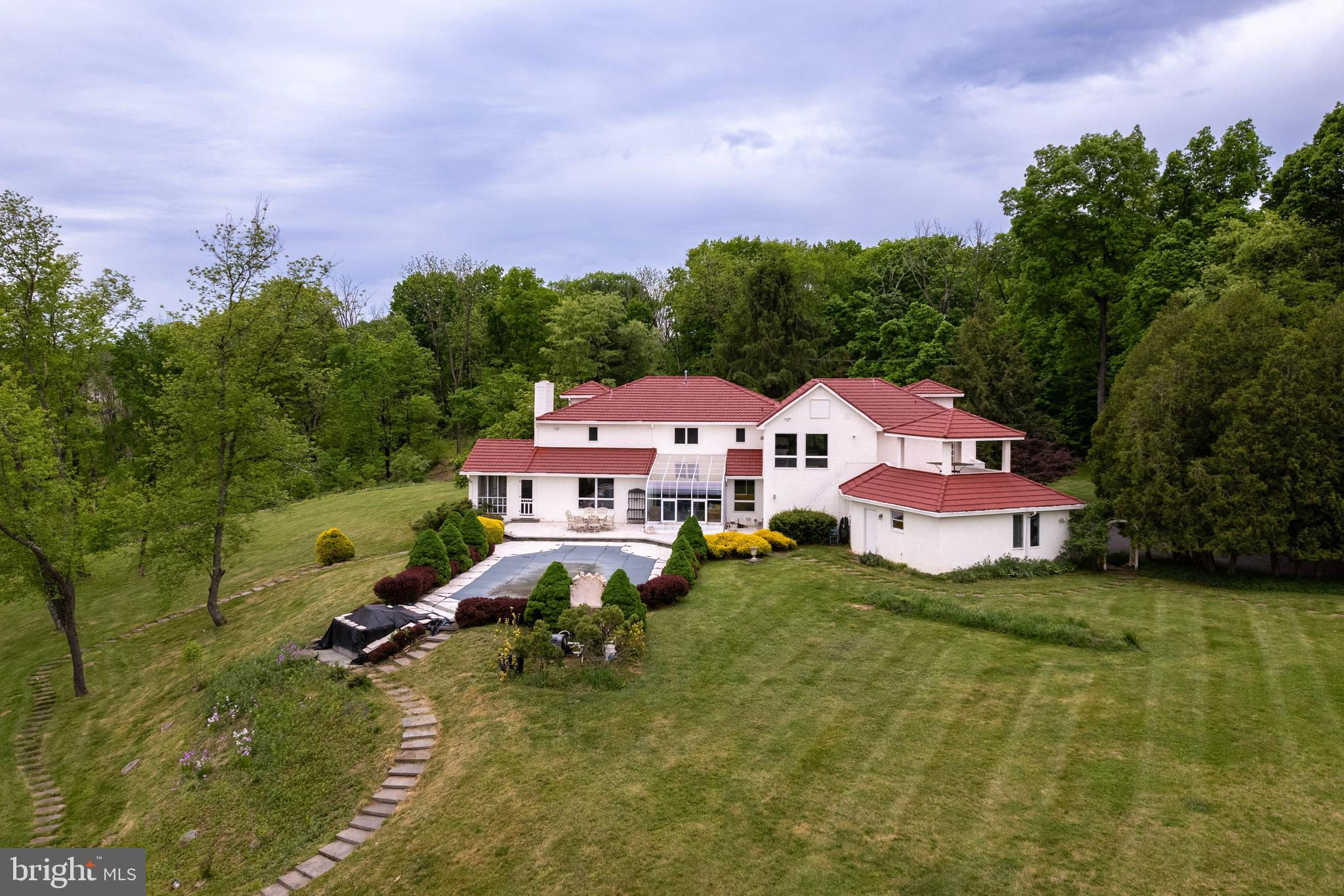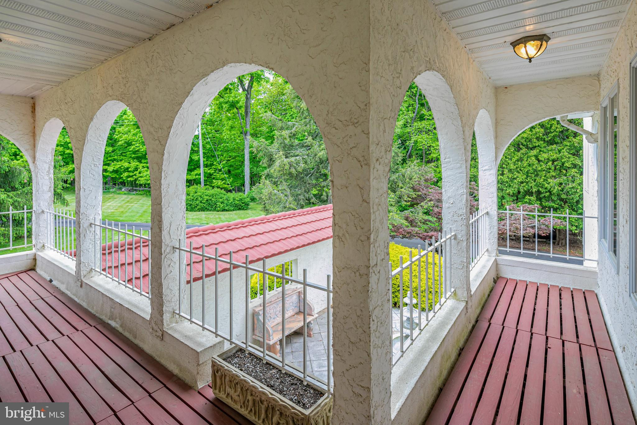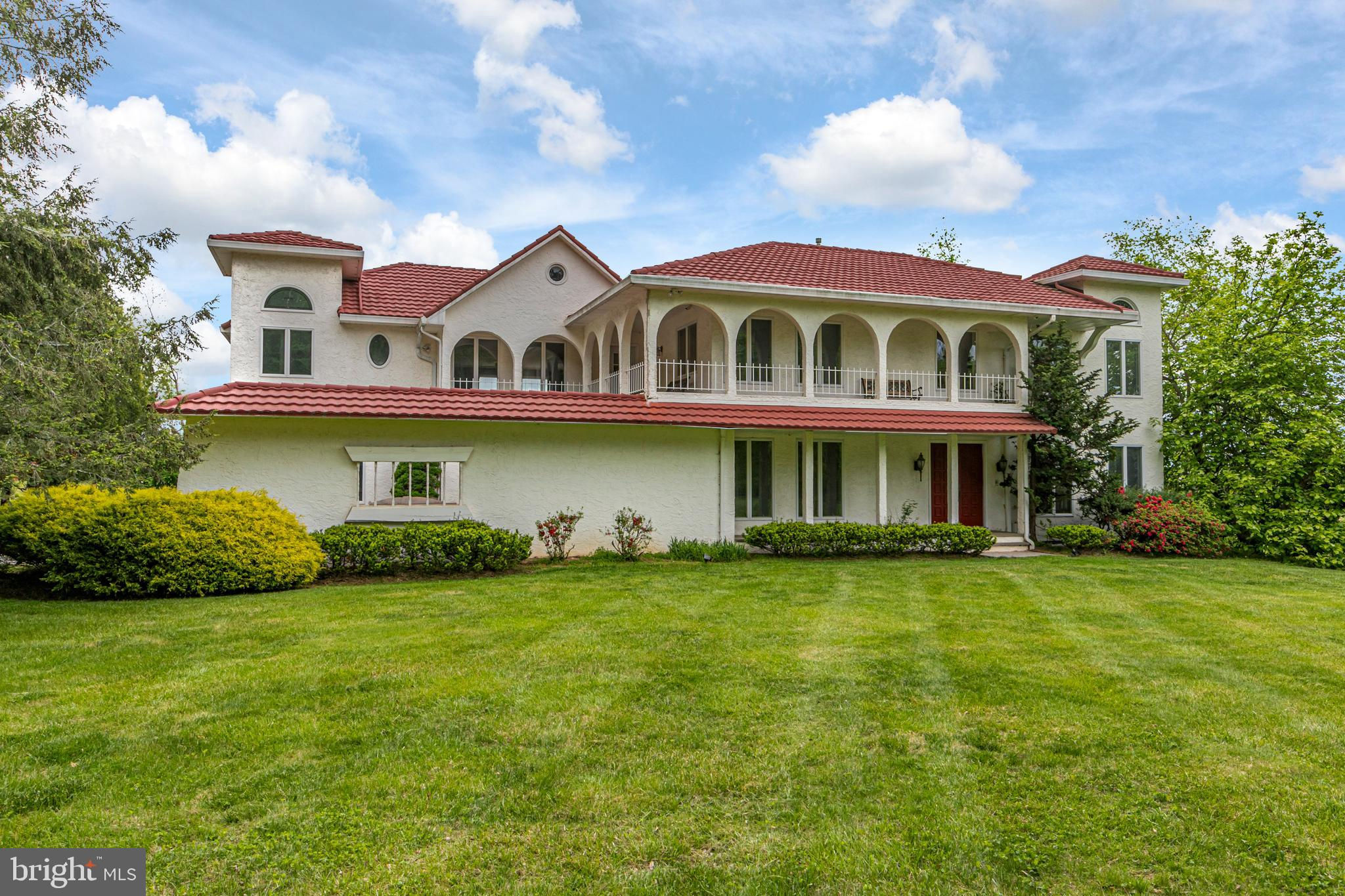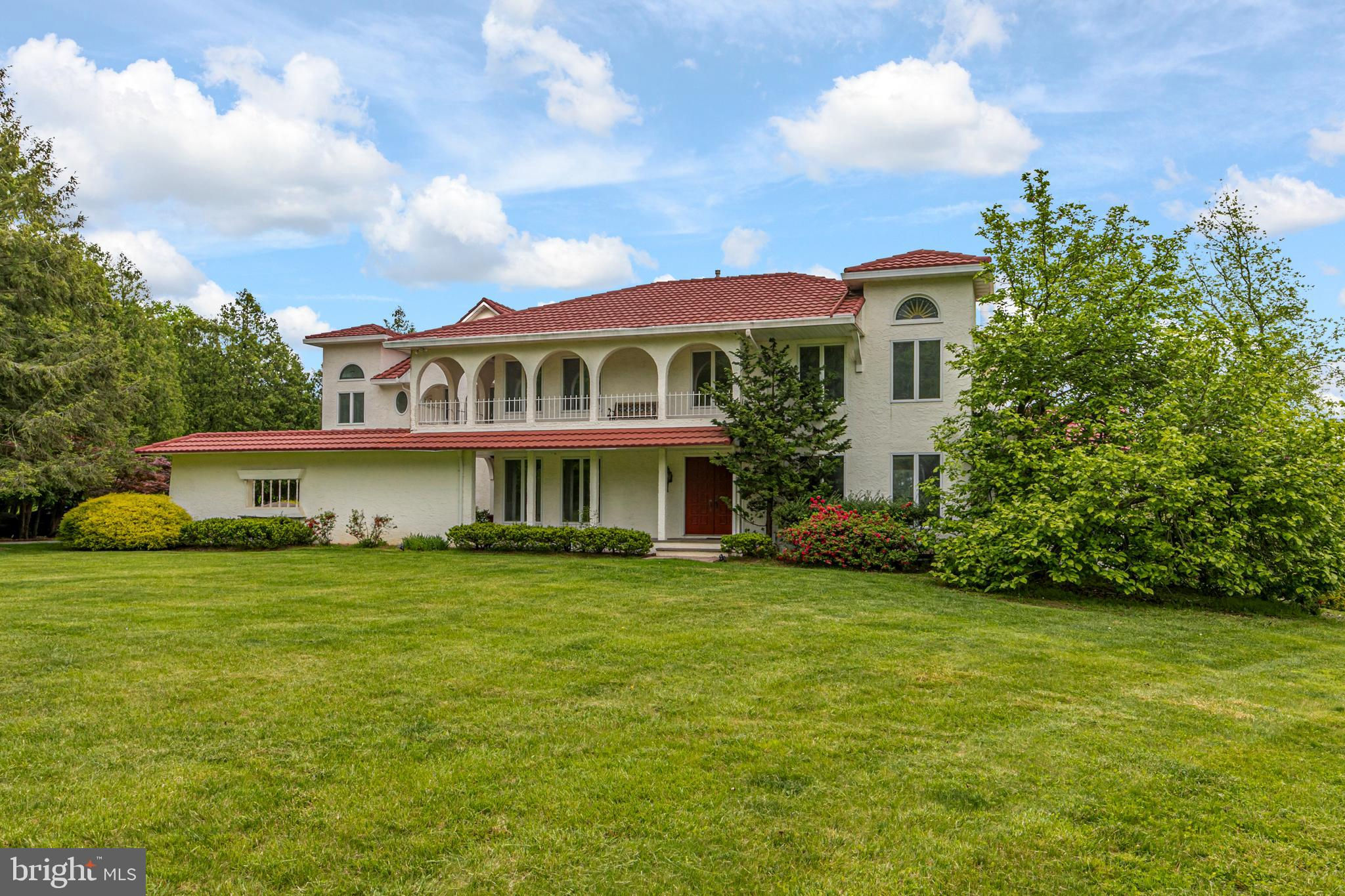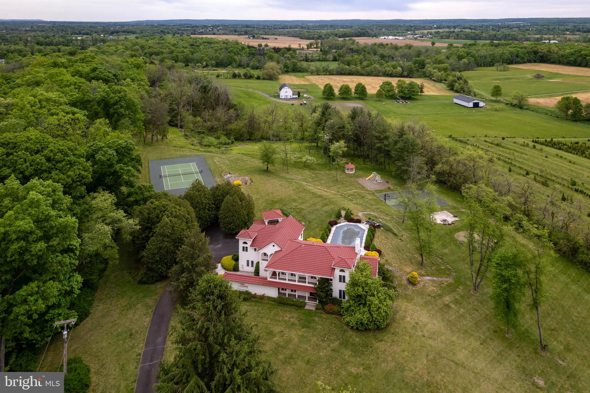 In the picturesque and tranquil rolling hills of Delaware Township, this hidden estate offers a lifestyle sure to please outdoor enthusiasts with a newly lined pool, a basketball court, a bocce court, a resurfaced tennis court, and a putting green. With its gracious gardens, serene views, and park-like surroundings, there’s so much to love about this location. A large, Mediterranean-inspired villa welcomes with a courtyard and a soothing fountain. Inside, the floor plan is designed to take in the scenery with the living room, currently used as the dining room, the family room, a glass-enclosed breakfast room, and a screened porch looking out across a dale of greenery. The kitchen is spacious and bright, adjoined by a large mudroom with custom cubbies for storage and a cleverly hidden laundry space. A home office is handy here and could serve other functions. Upstairs, there are four bedrooms, including two suites, and multiple wrap-around porches that provide breathtaking views of the countryside. The main suite has a dual-sided fireplace shared with a sitting room and a covered pavilion-style deck with steps down to the pool, making it simple to get some morning exercise. The over-the-top basement features a huge media/recreation room with a fireplace, a wine cellar, a gym, a half bath, and a door out to the gardens. Out by the pool, there’s a handy half bath to keep wet feet out of the house. A whole house generator and an automatic security gate with an intercom provide peace of mind.