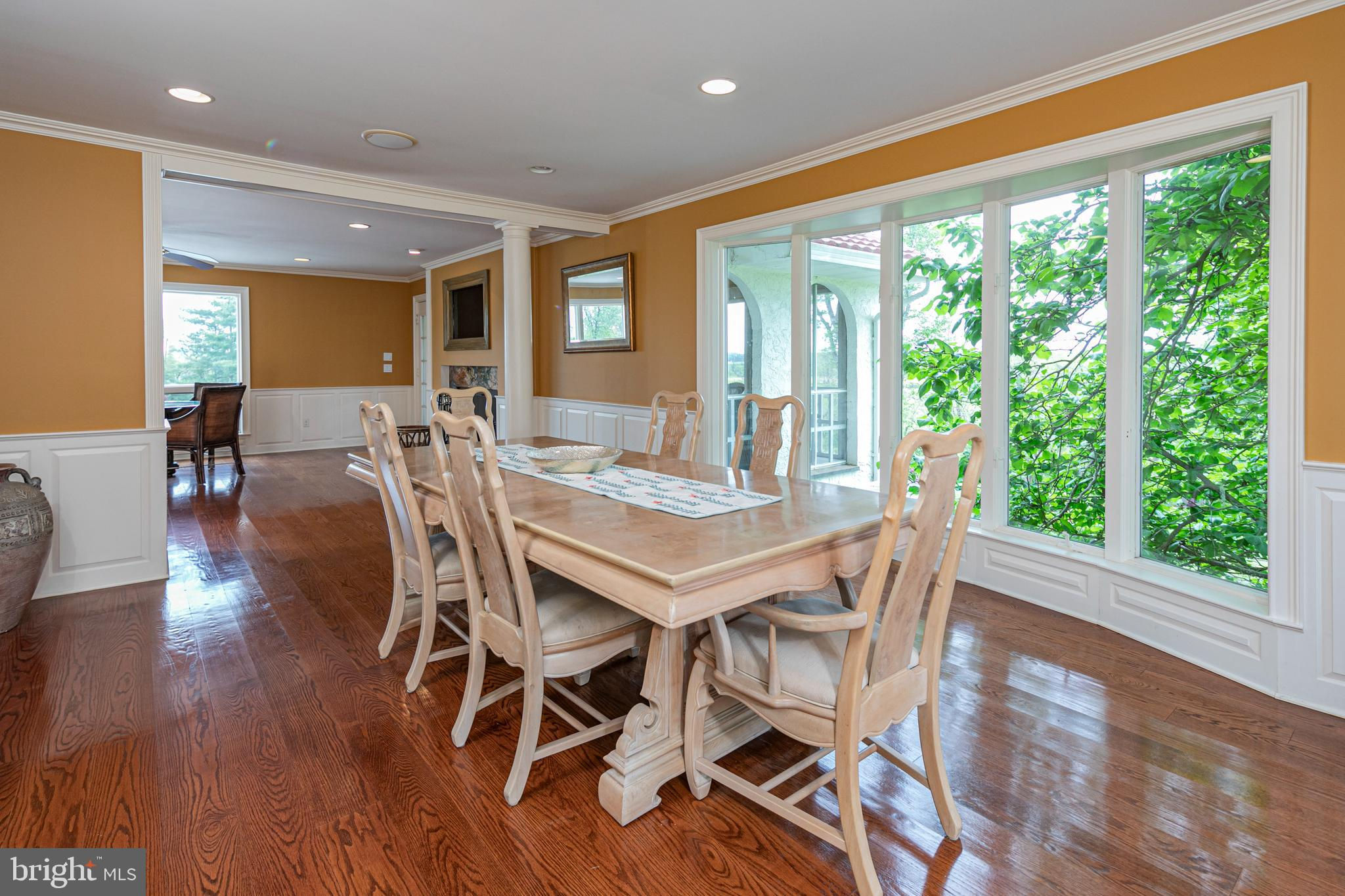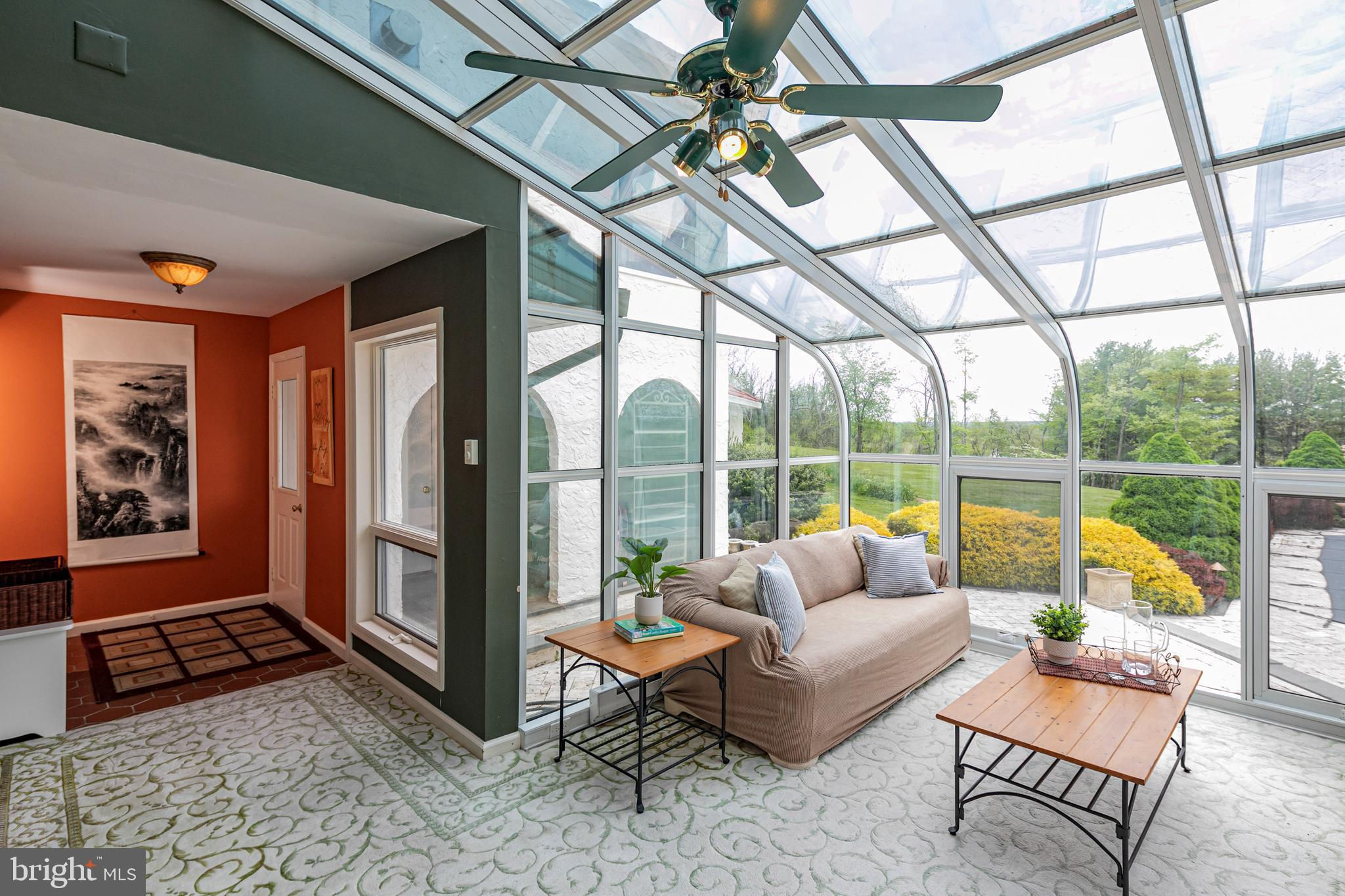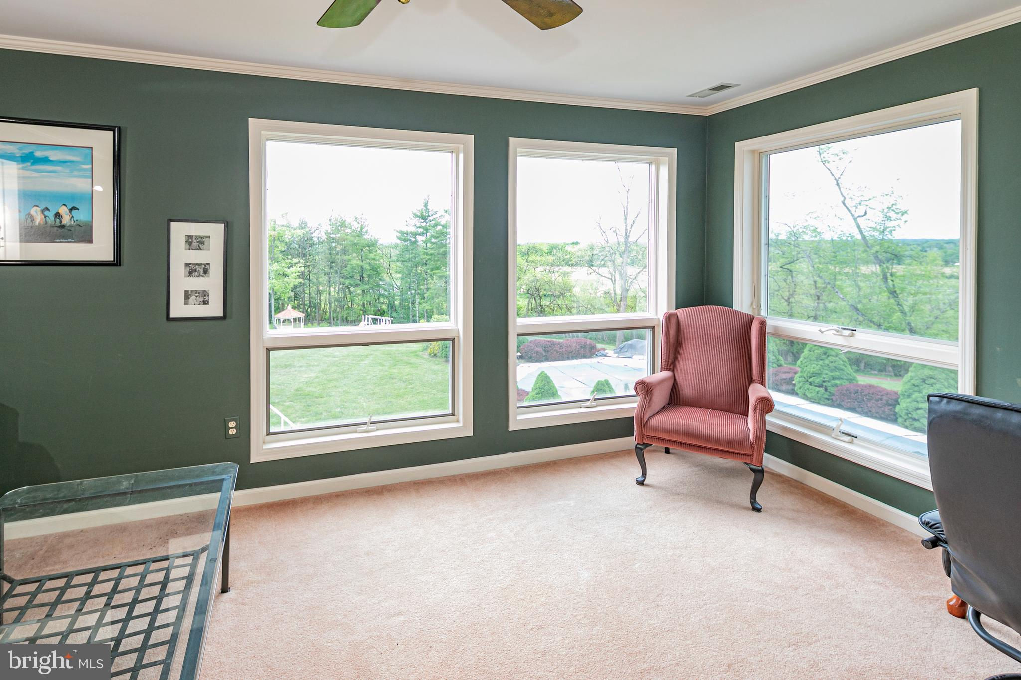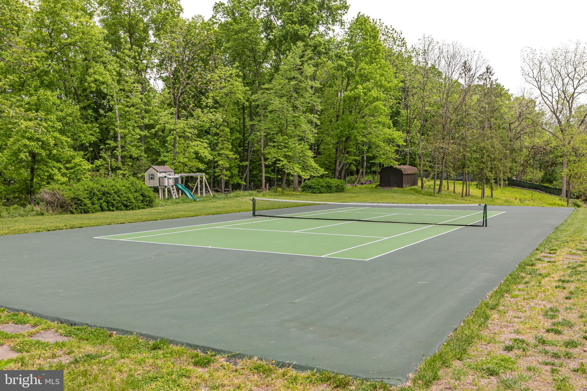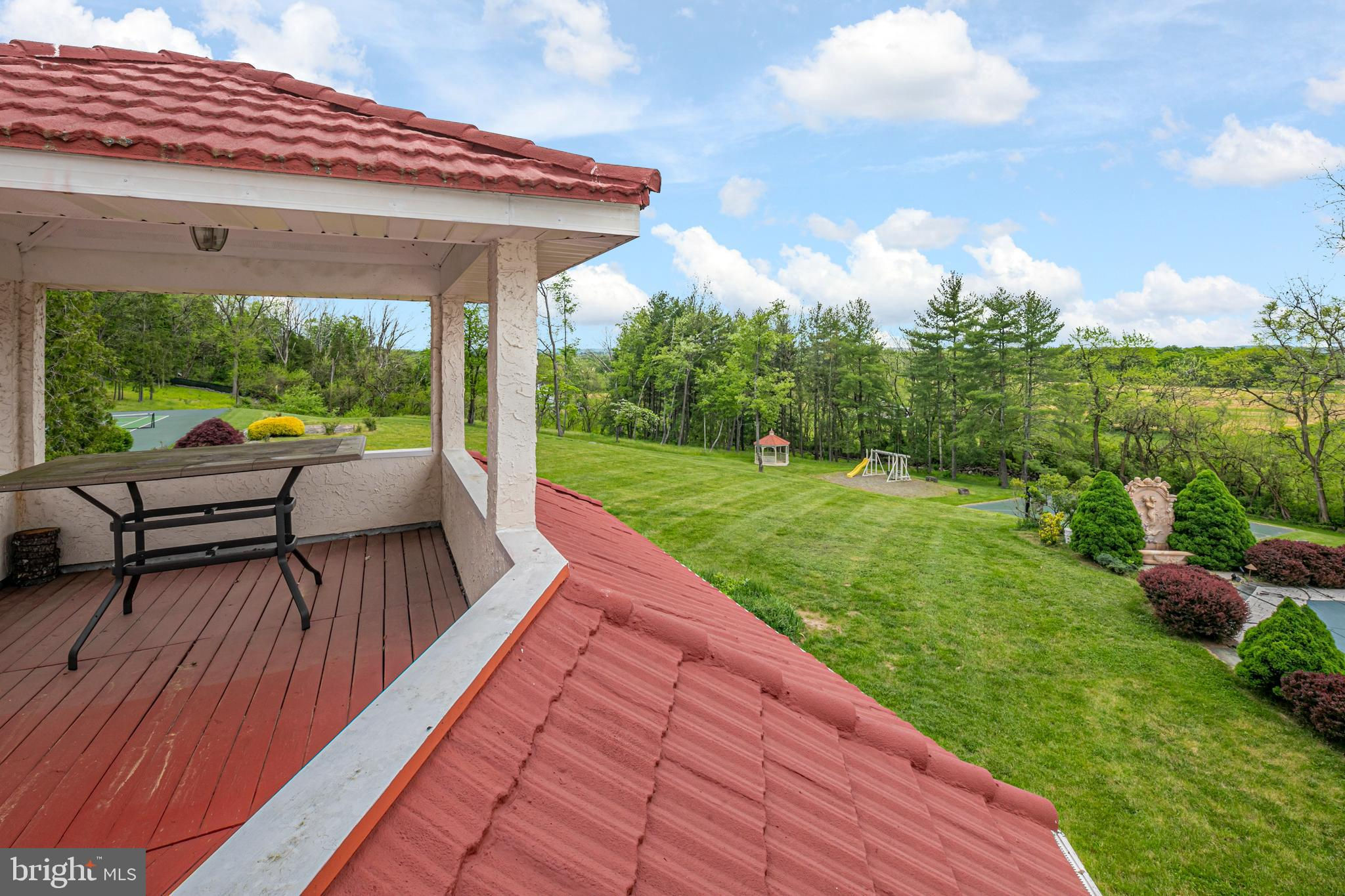 In the picturesque and tranquil rolling hills of Delaware Township, this hidden estate offers a lifestyle sure to please outdoor enthusiasts with a newly lined pool, a basketball court, a bocce court, a resurfaced tennis court, and a putting green. With its gracious gardens, serene views, and park-like surroundings, there’s so much to love about this location. A large, Mediterranean-inspired villa welcomes with a courtyard and a soothing fountain. Inside, the floor plan is designed to take in the scenery with the living room, currently used as the dining room, the family room, a glass-enclosed breakfast room, and a screened porch looking out across a dale of greenery. The kitchen is spacious and bright, adjoined by a large mudroom with custom cubbies for storage and a cleverly hidden laundry space. A home office is handy here and could serve other functions. Upstairs, there are four bedrooms, including two suites, and multiple wrap-around porches that provide breathtaking views of the countryside. The main suite has a dual-sided fireplace shared with a sitting room and a covered pavilion-style deck with steps down to the pool, making it simple to get some morning exercise. The over-the-top basement features a huge media/recreation room with a fireplace, a wine cellar, a gym, a half bath, and a door out to the gardens. Out by the pool, there’s a handy half bath to keep wet feet out of the house. A whole house generator and an automatic security gate with an intercom provide peace of mind.