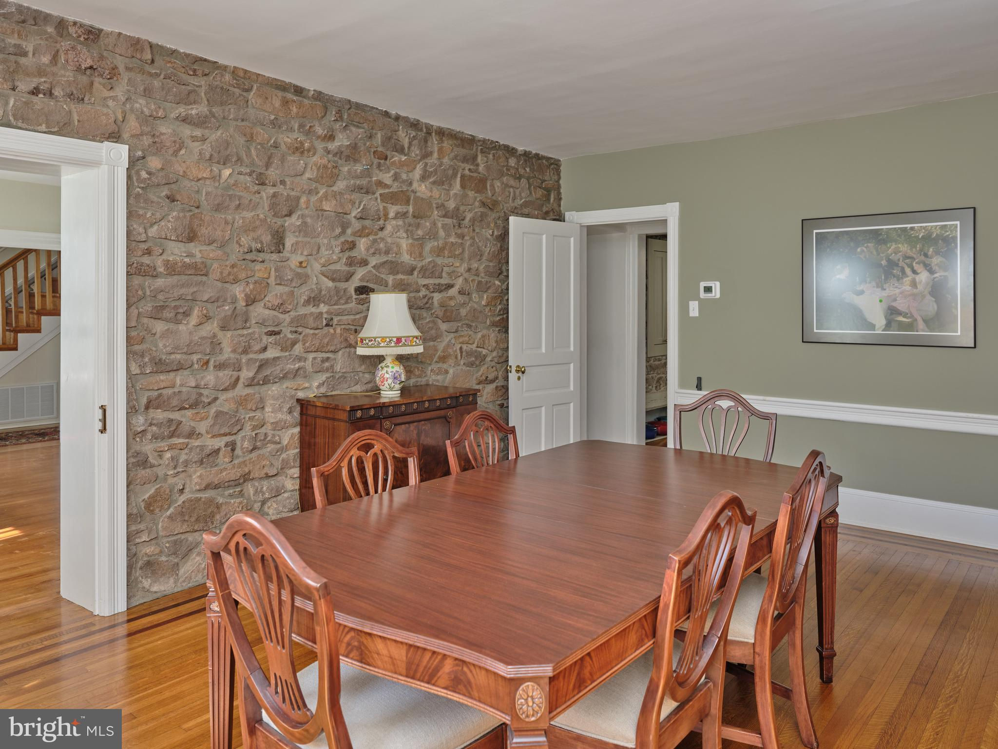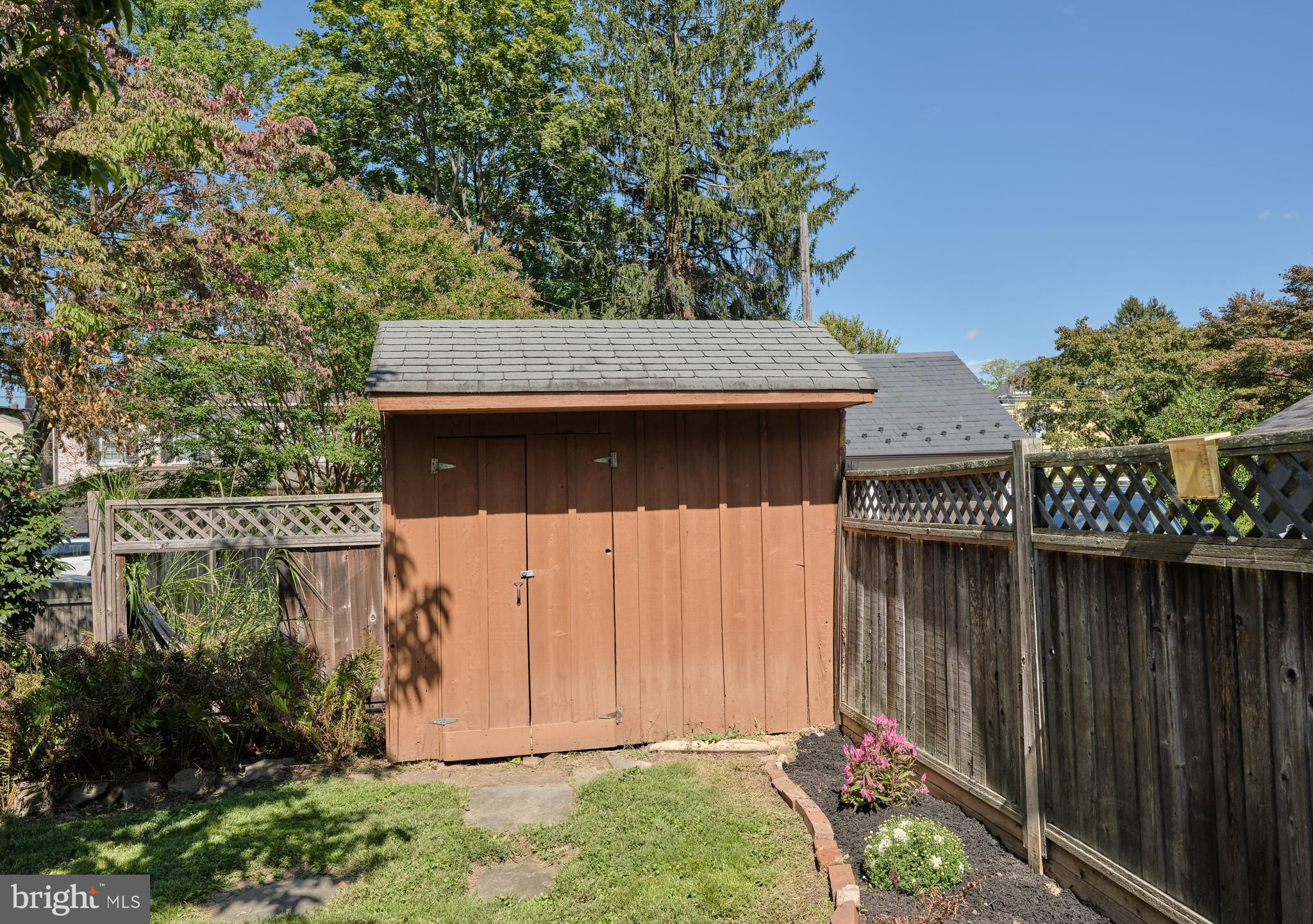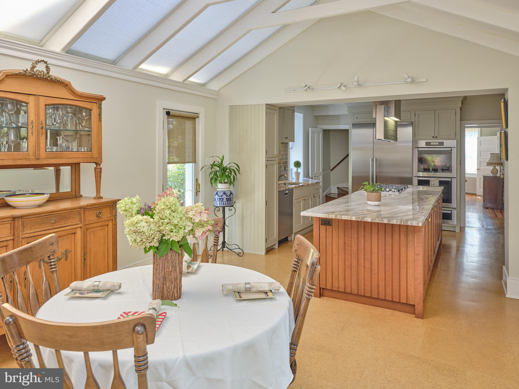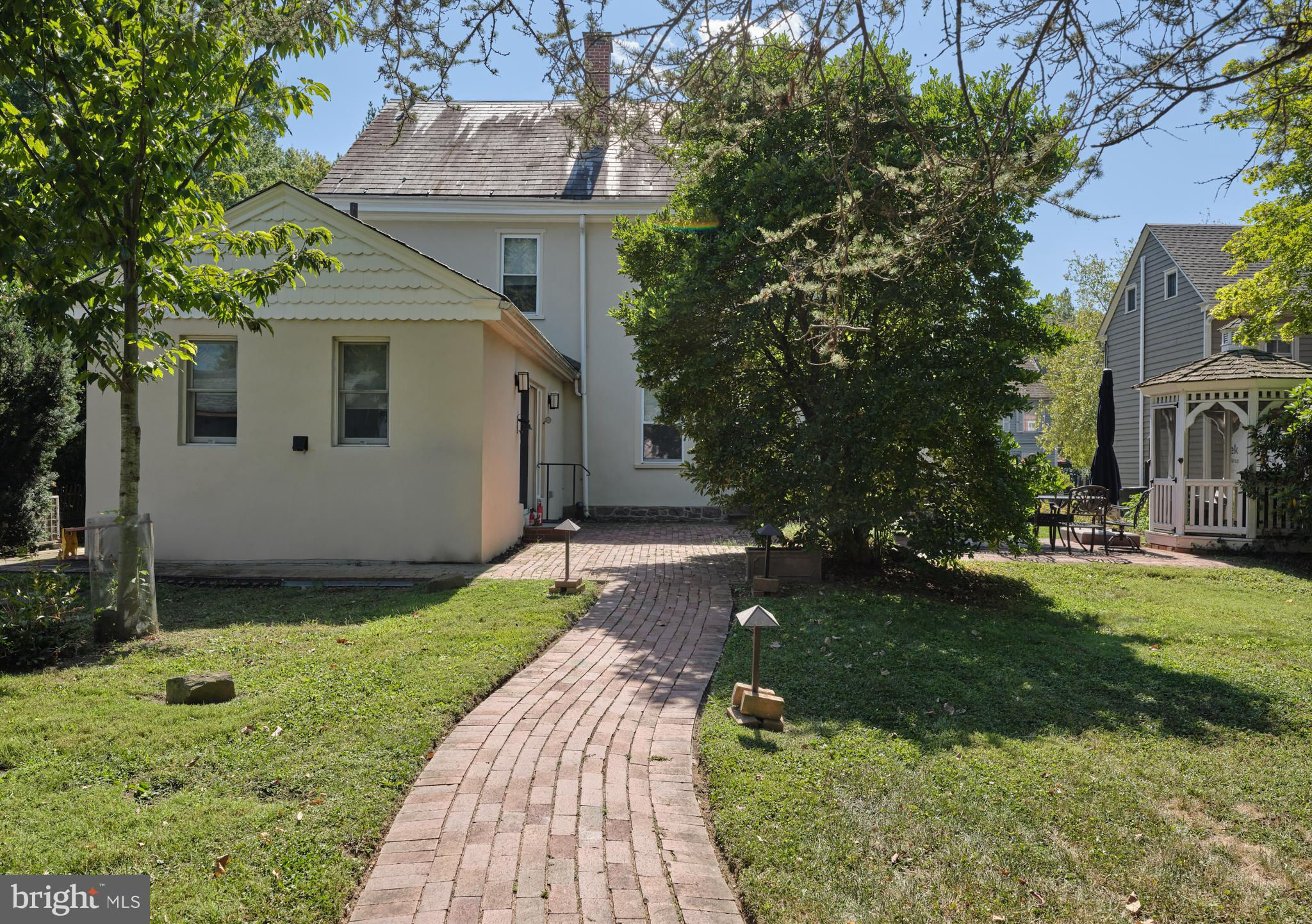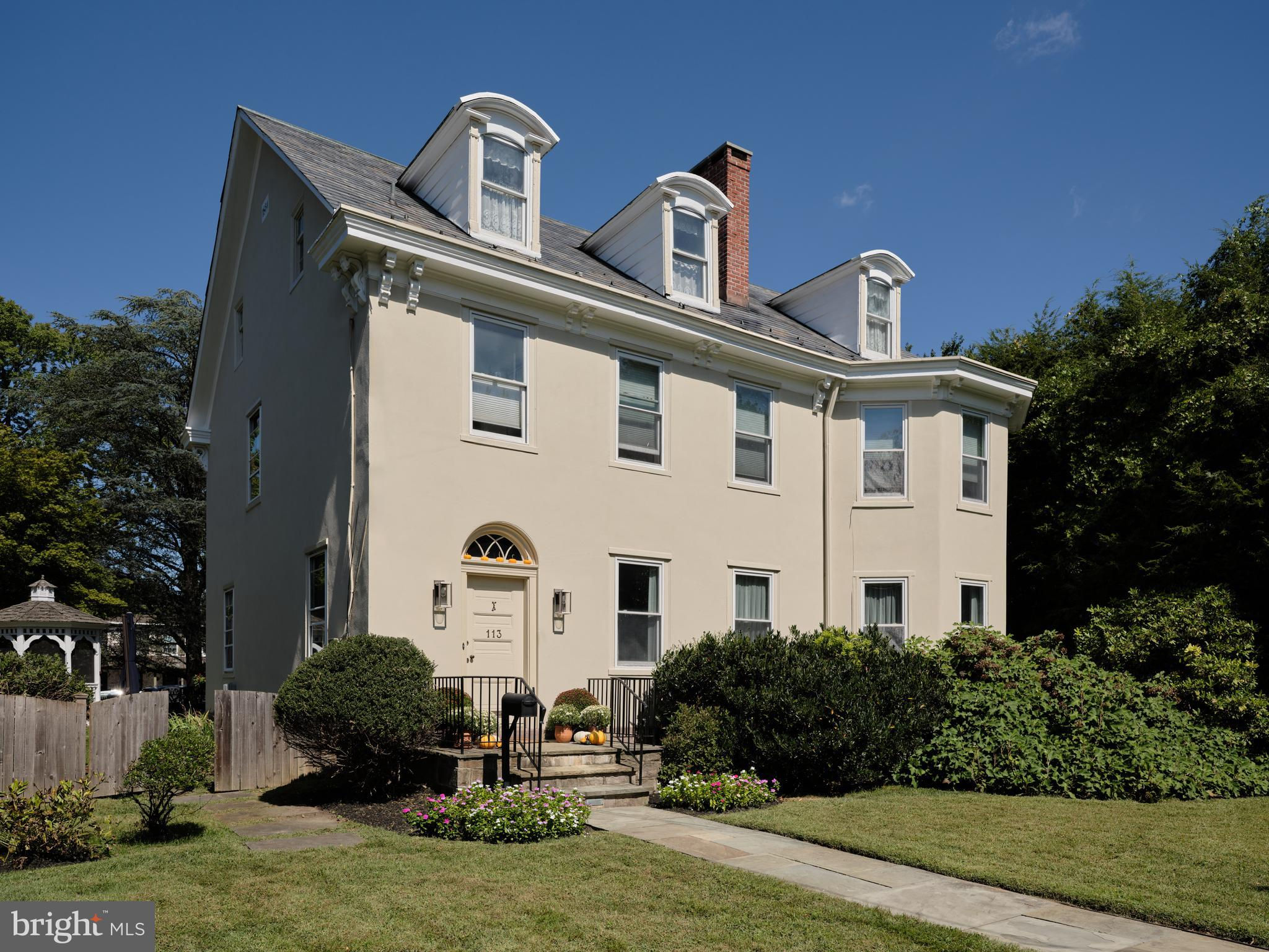 Originally constructed in 1834, consisting of stucco over stone, this handsome home had a 3 story addition in the 1880s, and a breakfast room addition in 1995. The property sits behind a gracious stone wall, accented by wrought iron fencing, with the lot stretching from Penn Street to Mercer Street - where access to the 2 story garage/barn is located. Ideally situated within walking distance to the heart of town - Starbucks is 2 blocks, Rocco's as well, and the ever popular Newtown Theatre is a 7 minute walk. The interior features a traditional floor plan. The living room has a gas fireplace, with a traditional mantel - in a style characteristic of vernacular Newtown style - as well as a built-in china cupboard. Wood floors are found in most of the public rooms - with the exception of the kitchen area, which features comfortable cork flooring. The dining room, part of the 1880s addition, is grand in size and one wall of stone indicates the exterior of the original 1834 construction. A large family room, with access to the rear brick patio, was originally the kitchen - based on the walk-in fireplace. The remnants of the beehive oven are clearly visible in this large fireplace. The kitchen is a gourmet delight - with Miele appliances, including 2 wall ovens, a warming drawer, dishwasher, side by side 48" refrigerator/freezer. A large island houses the gas cooktop and heavy duty drawers can hold an array of pots/ pans and small appliances. The cabinetry is custom with inset doors and soft close drawers. The 1995 breakfast room addition has atrium doors to the brick patio and features multiple skylights with remote controlled shades. This space also features the powder room and the laundry/butler's pantry/mud room. A back stairway off the kitchen leads to the bedrooms. There are 4 bedrooms on this upper level - all with wood floors. The primary bedroom features 2 closets. There are 3 additional bedrooms - one of which features 3 closets with built in drawers, and another with a cedar closet. Two full baths are located on this level - all with brass fixtures. One bath has a jetted tub with curved surround and a custom vanity recommissioned from an oak dresser, and the other bath features a walk in shower with seamless shower doors and a free standing sink with brass legs. The third floor has original flooring, plastered walls in the main room as well as a cedar walk-in closet, large mechanical/storage room, and spacious addition spanning the 1880 addition. This space would lend itself to a great bedroom suite. The view of the house from Penn Street gives the impression that the house does not have a driveway or off-street parking. A special feature of the house is the fact that it fronts on two streets - Penn Street and Mercer Street. The Mercer Street entrance features a very large parking area as well as a large 2 car garage/barn with second level storage. Entry to the rear yard is through the gated fence where a brick walkway leads you to the spacious patio and screed gazebo as well as kitchen and family room entrances. Ideally located within walking distance of all that Newtown Borough has to offer as well as 3 blocks to Septa Bus Line, 5 miles to rail station, and 2 miles to 95/295,