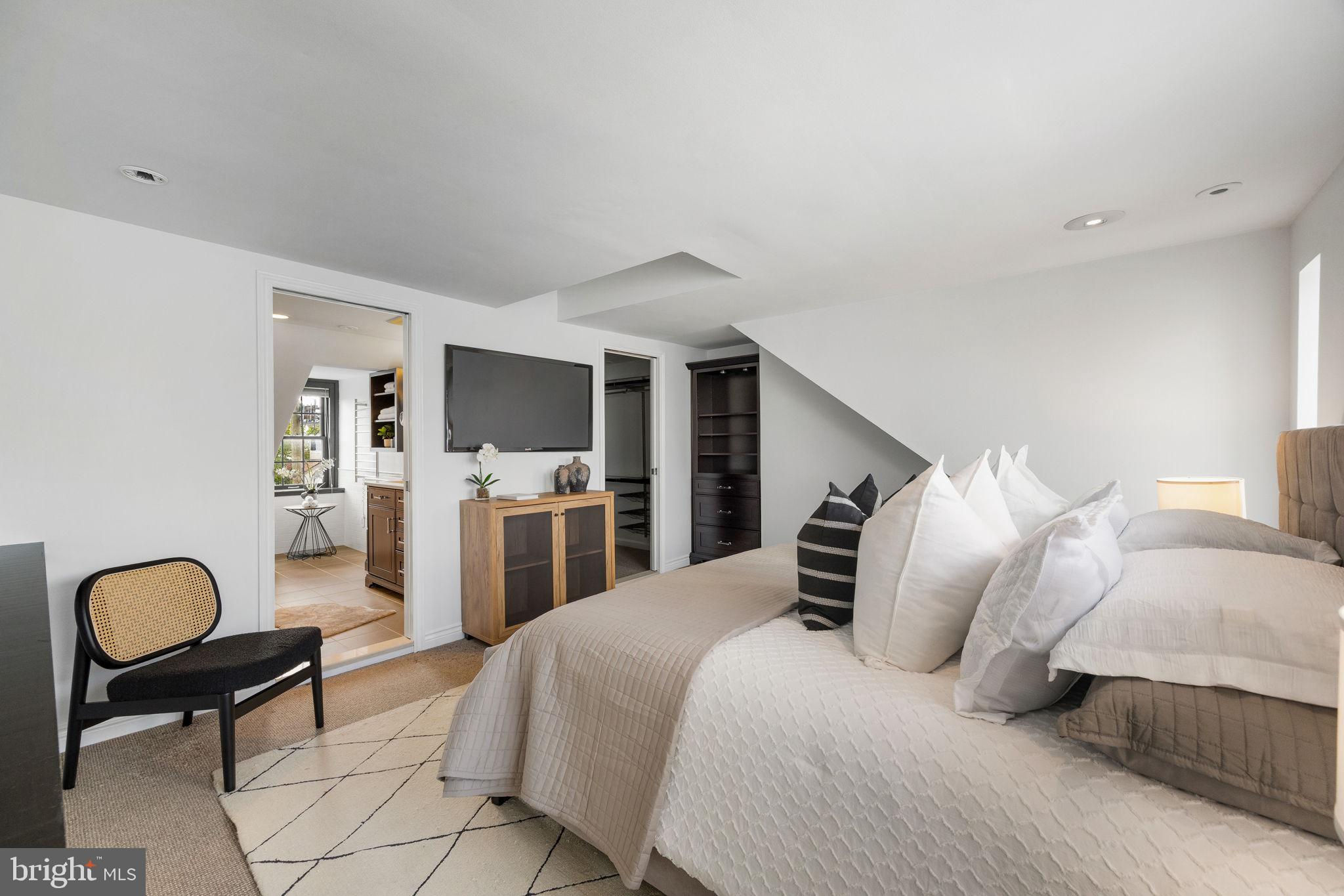 Welcome to 129 Bainbridge, a distinctive residence tucked along a picturesque, tree-lined street in the heart of Queen Village.This rare offering combines a sophisticated four-story townhome with a charming trinity-style annex, accessible through a private gated entrance. Together, they present an exceptional opportunity for multi-generational living, an au pair or guest suite, or an income-producing residence.The main townhome unfolds with an elegant sense of proportion and detail. The formal living room greets you with a fireplace mantle and bespoke built-ins —a refined yet inviting setting. This level also features a full bedroom and bath, plus the washer & dryer, ideal for guests or a home office.The second floor is designed for gathering: an open, contemporary kitchen with abundant cabinetry overlooks a gracious family room anchored by another fireplace and custom shelving. A formal dining room and powder room enhance the home’s sense of ease and flow, making entertaining effortless.On the third floor, a private bedroom suite with en-suite bath is paired with a den or office space, offering access to a serene outdoor deck. A wet bar is also on this level for easy access when enjoying al-fresco drinks. The top floor is devoted to the primary suite, crowned by vaulted ceilings. Here, a walk-in closet and spa-inspired bath with seamless glass shower, free-standing soaking tub, and double vanity create a true sanctuary.Additional features include a full, unfinished basement with ample storage space.Beyond the primary residence, a landscaped courtyard leads to the adjoining Trinity, which features one bedroom with 1.5 bathrooms, plus an unfinished basement with laundry facilities. Steeped in historic charm yet flexible in function, this separate dwelling extends the home’s possibilities—whether as a rental, a private retreat for guests, or a quiet studio tucked away from the city’s energy.129 Bainbridge is a rare blend of architectural character, thoughtful design, and urban versatility—all in one of Philadelphia’s most beloved neighborhoods. Located within the Meredith Elementary School catchment.