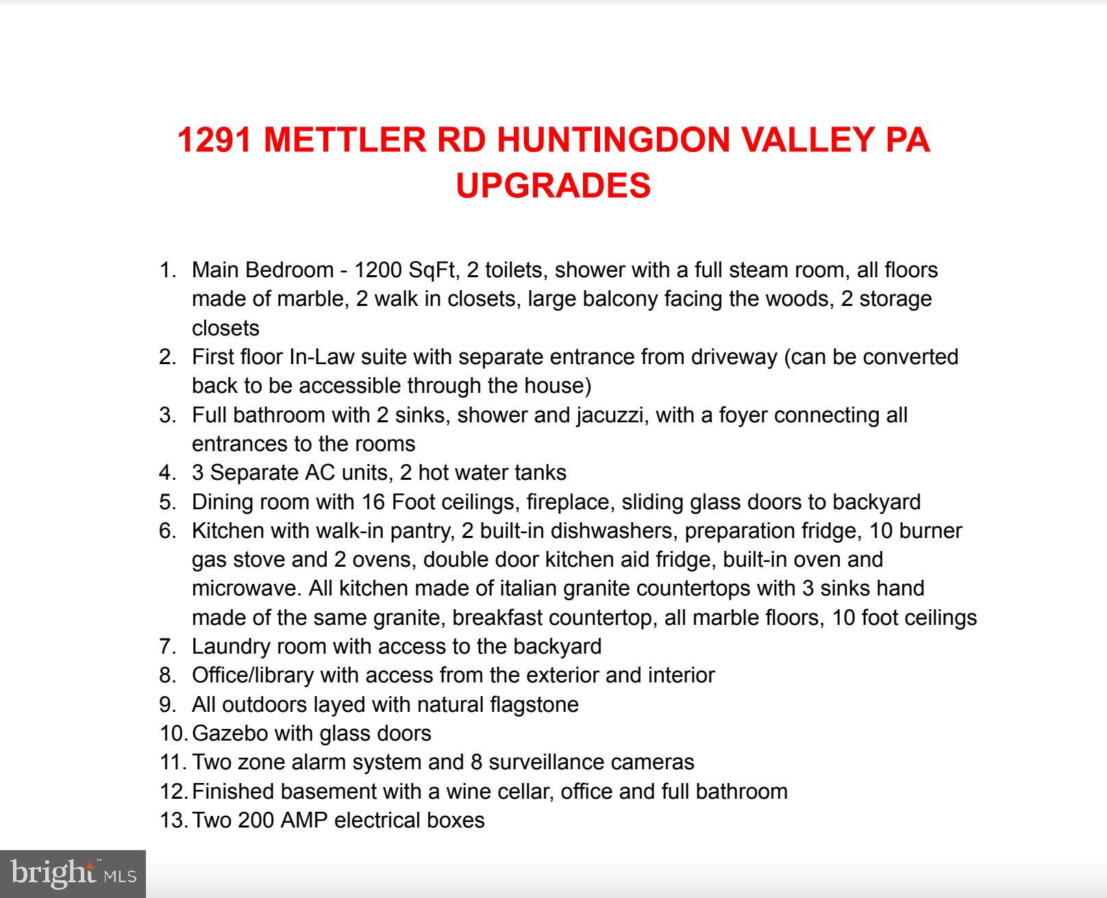 Nestled amidst the serene landscape of Huntingdon Valley this 7900 sq ft this home presents a captivating blend of luxury and functionality. This stately five (5) bedroom residence, includes a first floor bedroom with a full bath that includes its own separate entrance and opens the possibility to be used as an in law suite or rented out for source of additional income. With 4 bedrooms thoughtfully designed for convenience and comfort, this home offers unparalleled opulence. Stepping into the expansive master bedroom, spanning over 1200 square feet, one is greeted by lavish amenities including a full steam room, opulent marble floors, and not one but two walk-in closets. A grand balcony beckons, providing an idyllic retreat overlooking the verdant woods. The hall bath indulges with dual sinks, a luxurious shower, and a rejuvenating Jacuzzi tub. A gracious foyer seamlessly connects all entrances to the various rooms, inviting residents and guests alike into a world of sophistication. The fourth bedroom comes with a large walk in closet as well as its own jacuzzi inside the bedroom. The private library offers a haven for quiet contemplation. The heart of the home lies in its gourmet kitchen, adorned with Italian granite countertops and equipped with every culinary convenience imaginable. Dual dishwashers, a 10-burner gas stove, double ovens, and a KitchenAid refrigerator stand as testaments to culinary excellence. Sliding glass doors from the dining room lead to the backyard oasis, where an in-ground pool awaits, promising endless hours of relaxation and entertainment. The dining area, adorned with exquisite marble floors and boasting soaring 16-foot ceilings, exudes elegance and warmth. A fireplace adds a touch of coziness to intimate gatherings, while providing a focal point for memorable occasions. Descending into the finished basement reveals a wealth of additional amenities, including a wine cellar, an additional living space, a well-appointed office, a cozy TV room, and a full bathroom. Ceramic tile floors add a touch of sophistication to this multifunctional space. All pool equipment is less than two years old, ensuring seamless enjoyment of this outdoor haven. Seller is willing to give concessions to the right offer