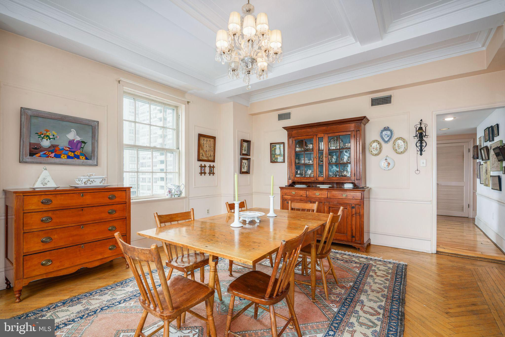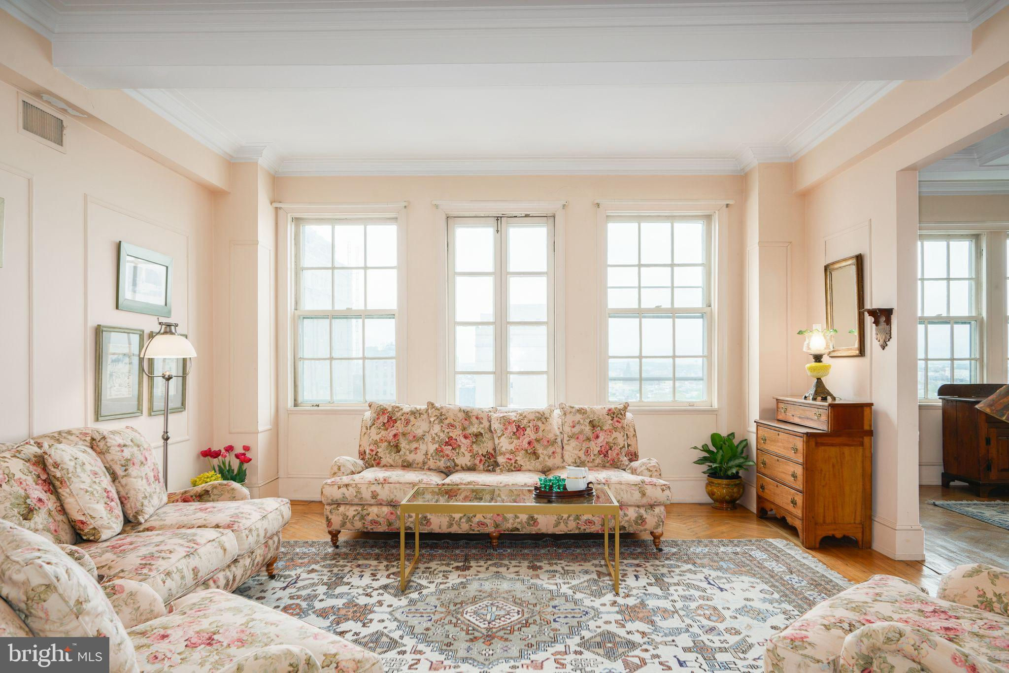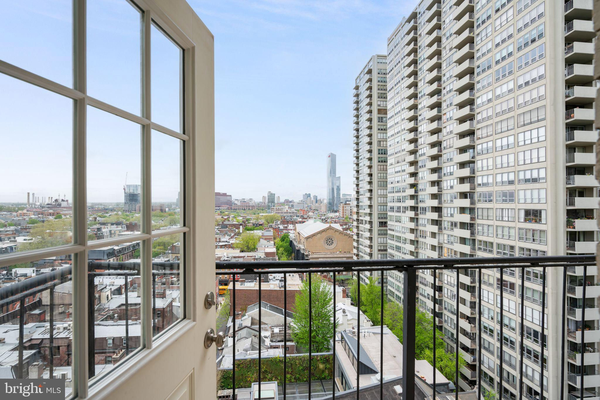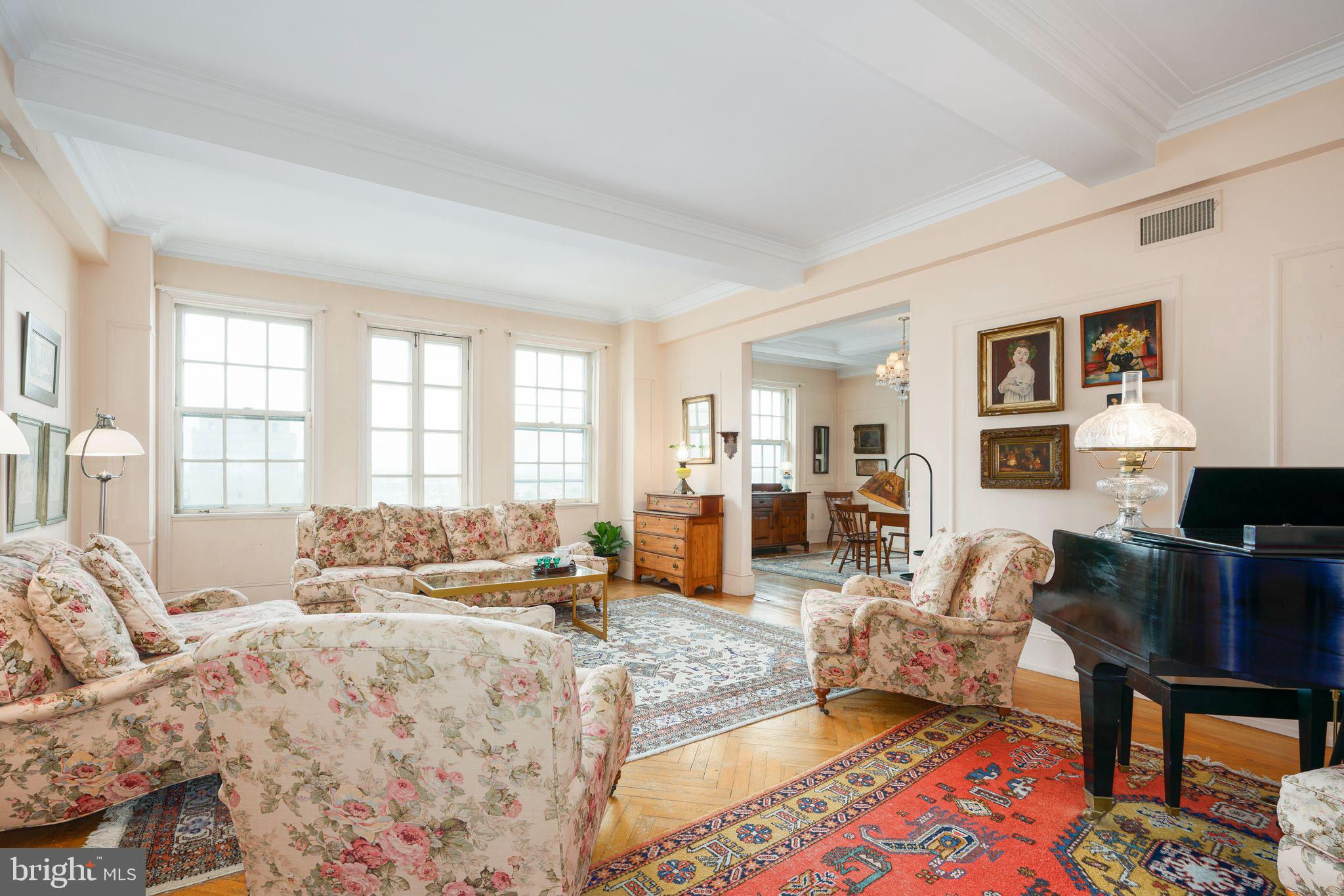 This beautiful 2,197 square foot 12th floor pre-war apartment feels like HOME. Enter pretty foyer with large coat closet, chandelier and marble floors. Spacious and bright living room with herringbone wood floors and crown moulding open to beautifully appointed formal dining room with windows facing South and West. Door to large eat-in-kitchen with ample cabinetry, China closet and door to sunny terrace. Hallway with door to large laundry room and powder room. Primary bedroom suite features sitting room with built-in millwork bookshelves and desk, closet bar and pocket doors to bedroom. Large walk-in-closet and bathroom with stall shower and marble wainscoting. Spacious 2nd bedroom with en-suite bath with marble floor and tiled tub/shower. 1900 Rittenhouse Square is a boutique building with 24-hour doorman, steps from restaurants, shops and all Rittenhouse Square has to offer.
