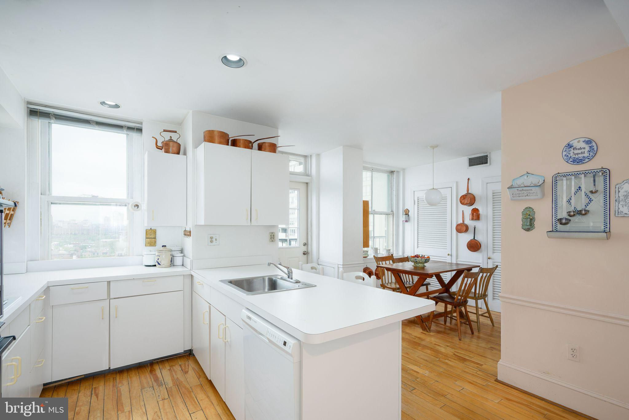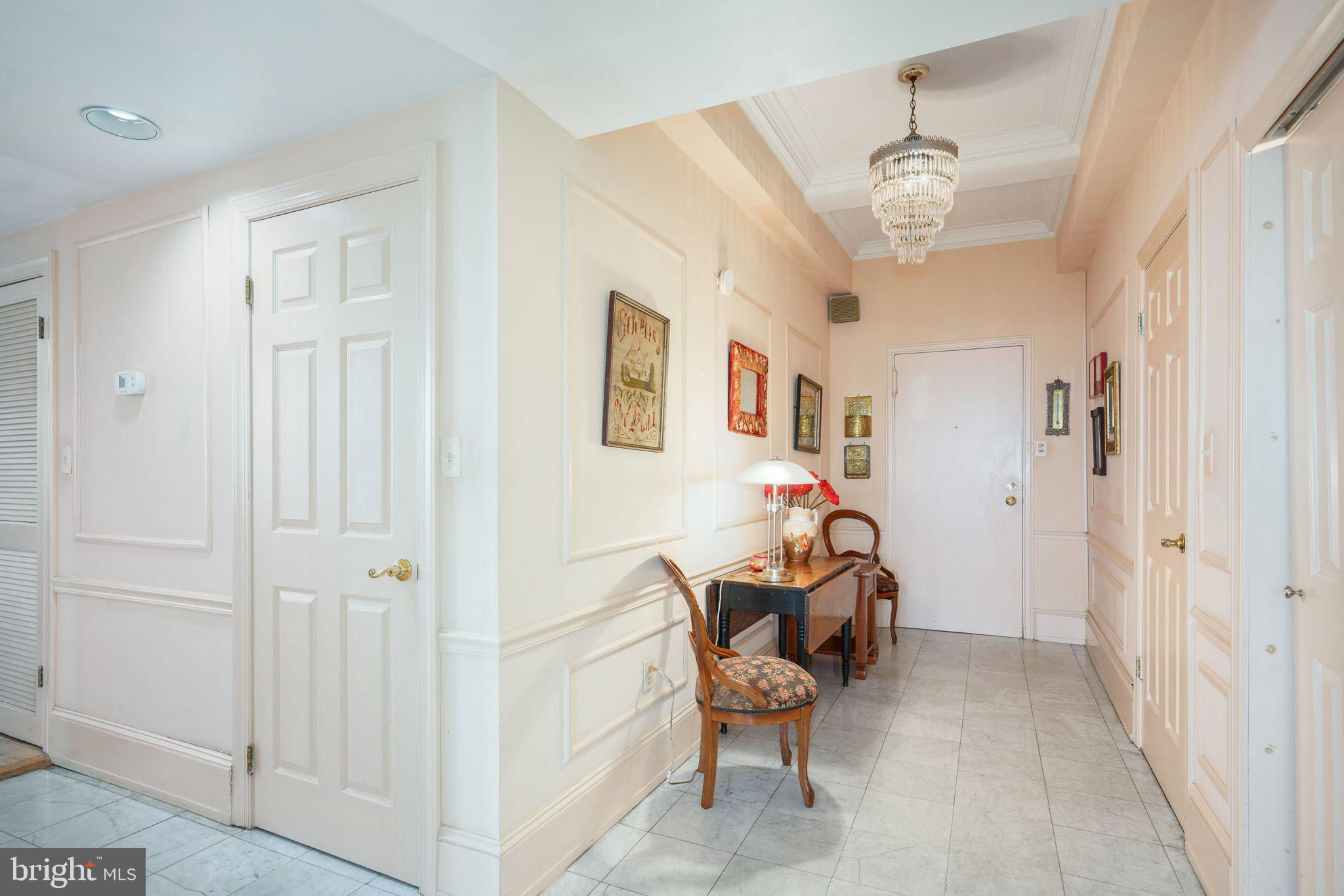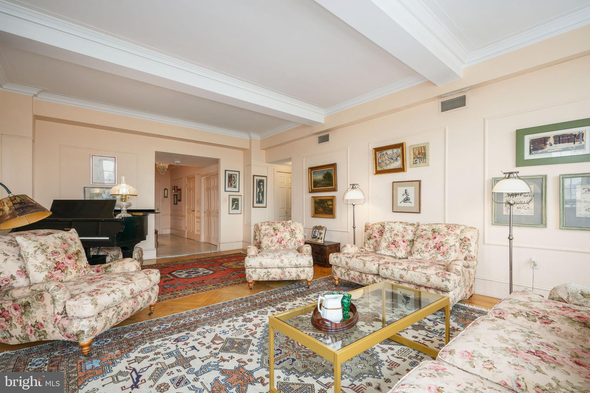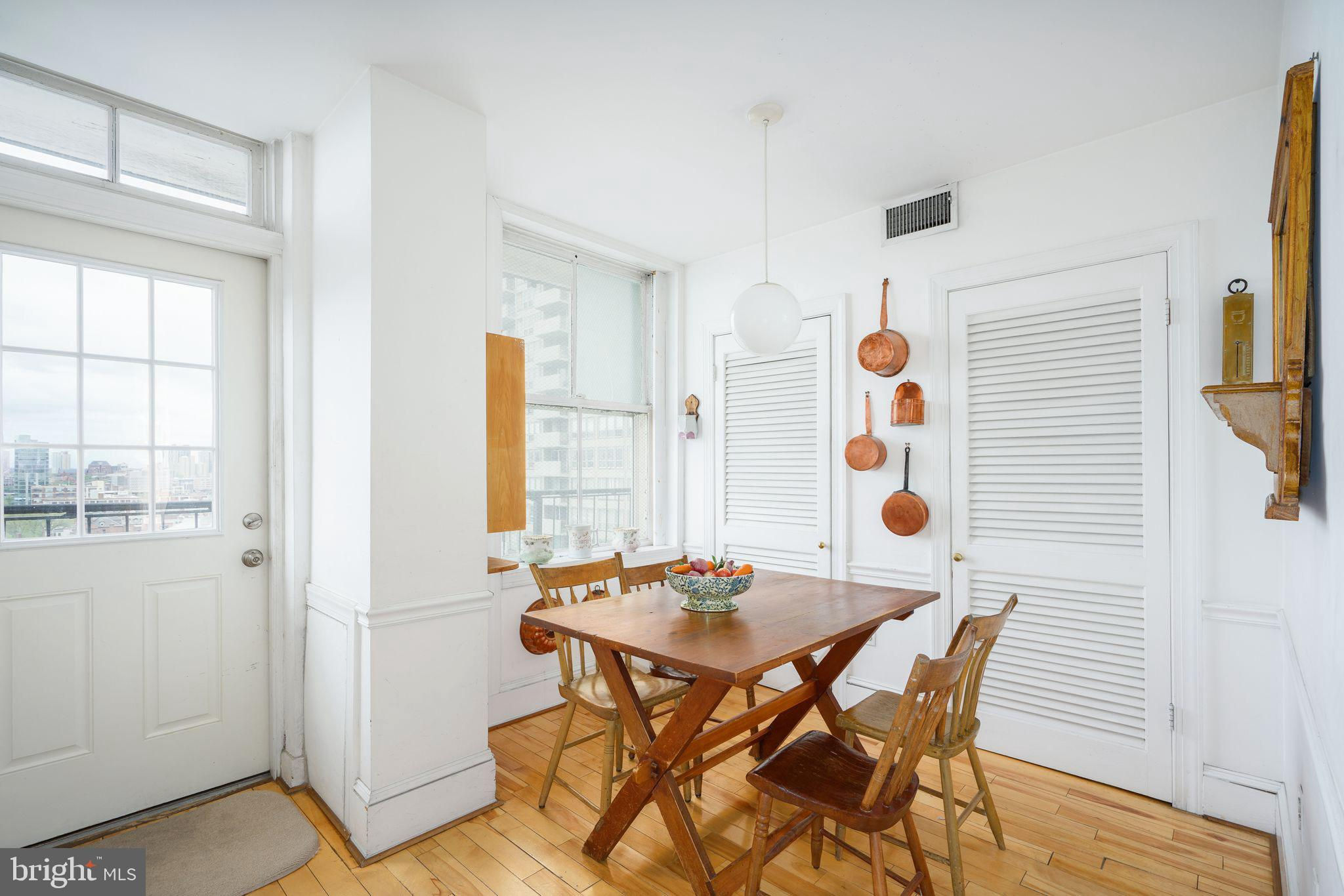 This beautiful 2,197 square foot 12th floor pre-war apartment feels like HOME. Enter pretty foyer with large coat closet, chandelier and marble floors. Spacious and bright living room with herringbone wood floors and crown moulding open to beautifully appointed formal dining room with windows facing South and West. Door to large eat-in-kitchen with ample cabinetry, China closet and door to sunny terrace. Hallway with door to large laundry room and powder room. Primary bedroom suite features sitting room with built-in millwork bookshelves and desk, closet bar and pocket doors to bedroom. Large walk-in-closet and bathroom with stall shower and marble wainscoting. Spacious 2nd bedroom with en-suite bath with marble floor and tiled tub/shower. 1900 Rittenhouse Square is a boutique building with 24-hour doorman, steps from restaurants, shops and all Rittenhouse Square has to offer.