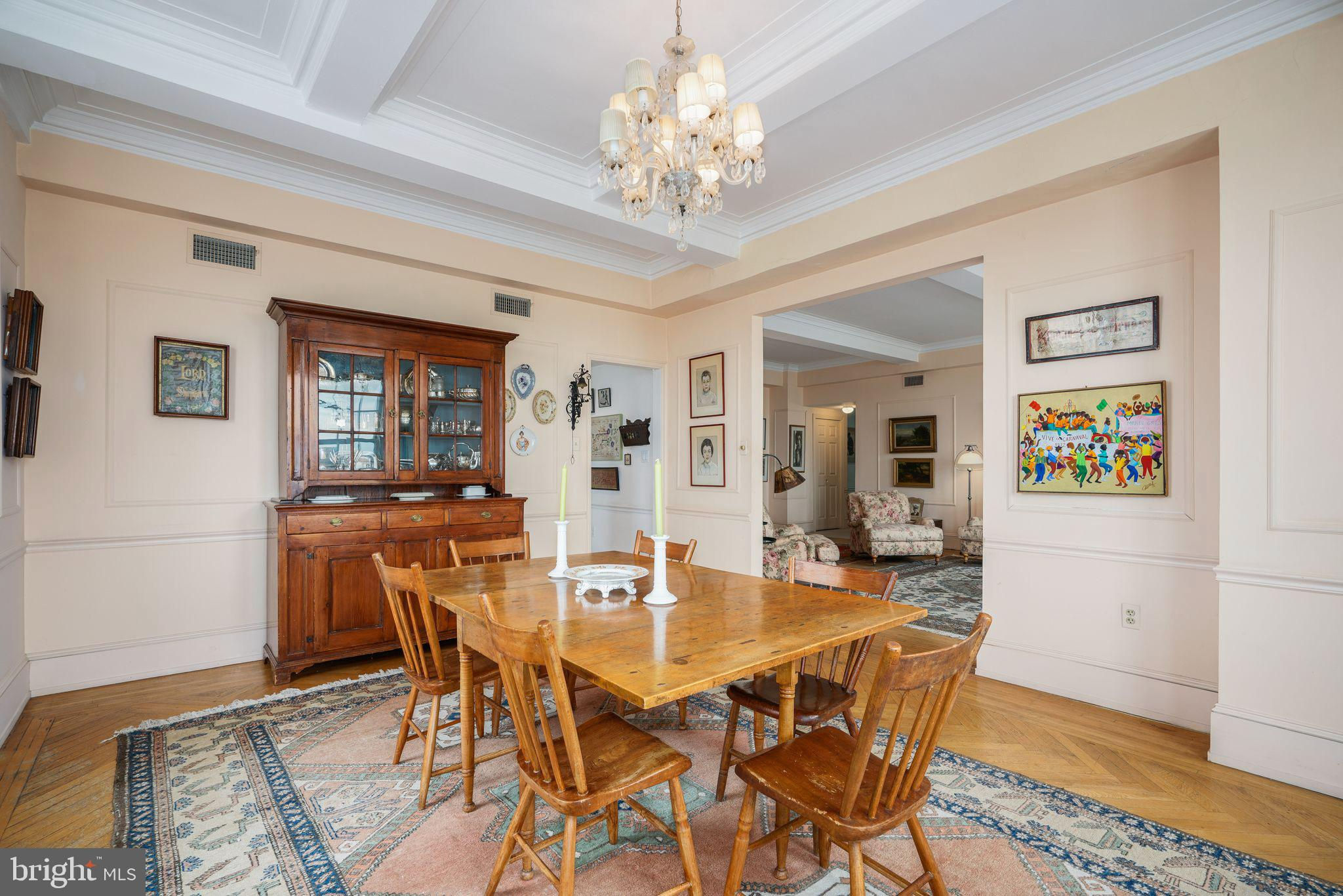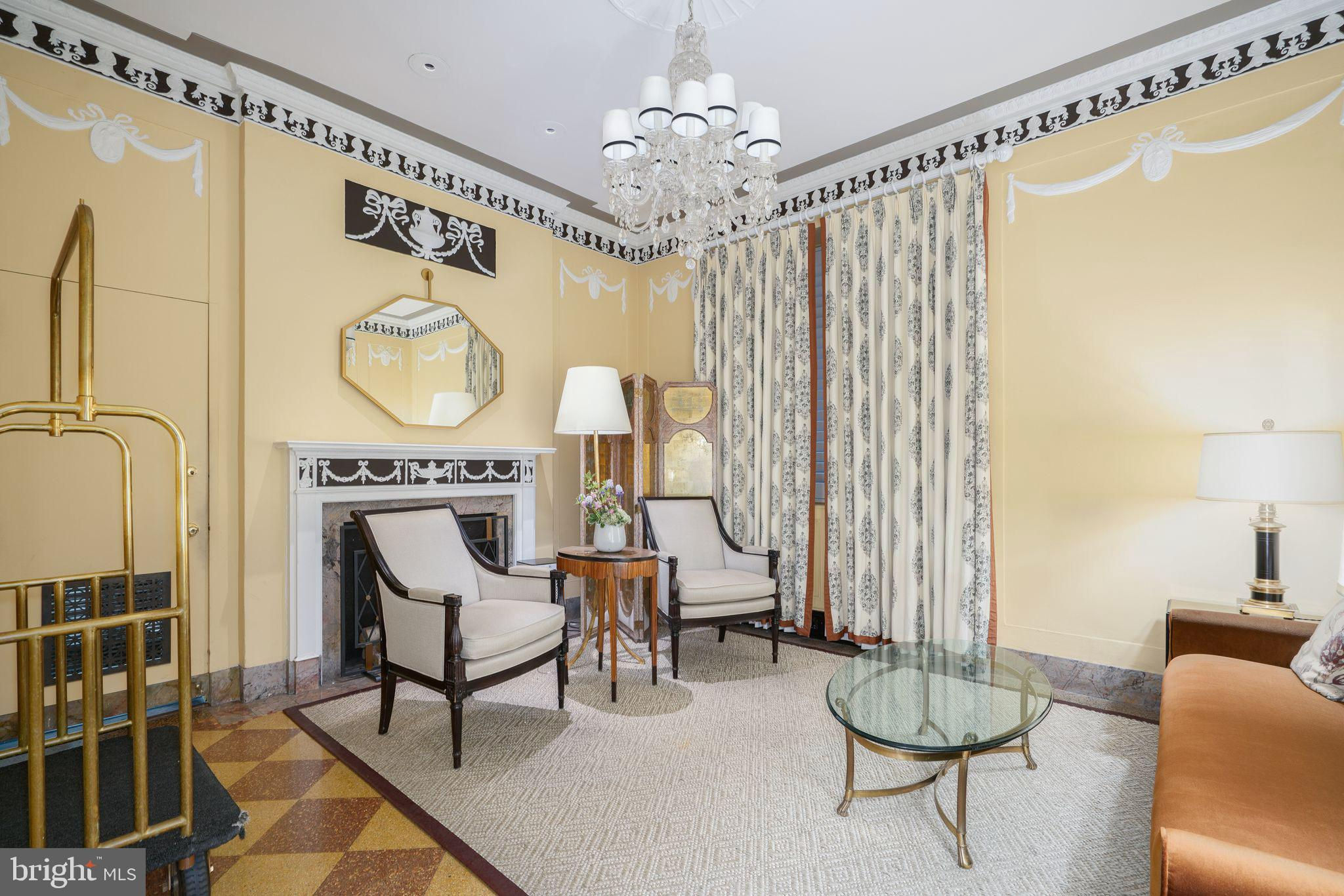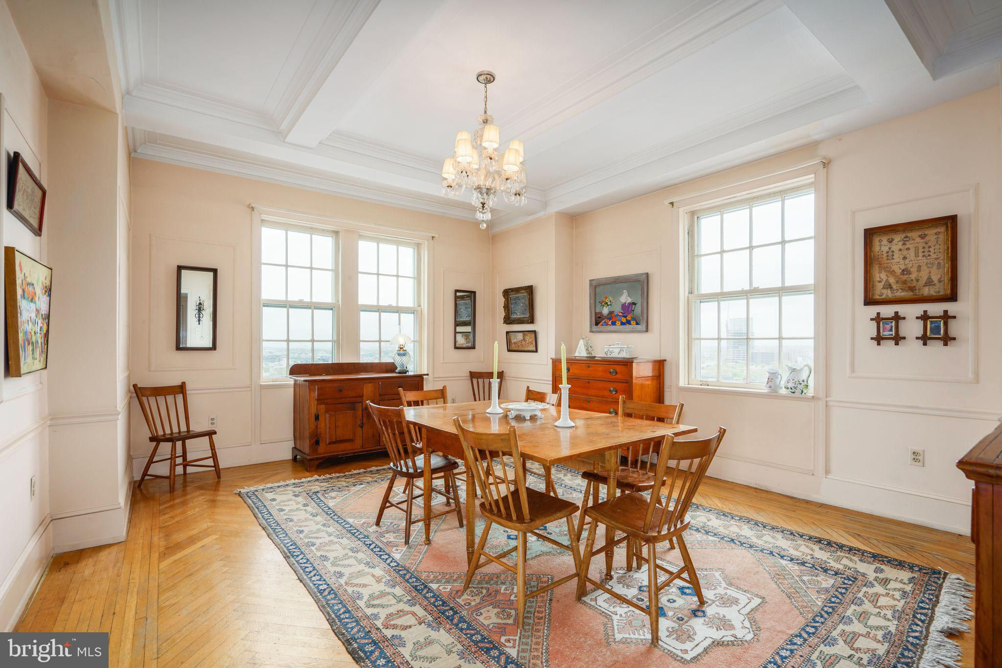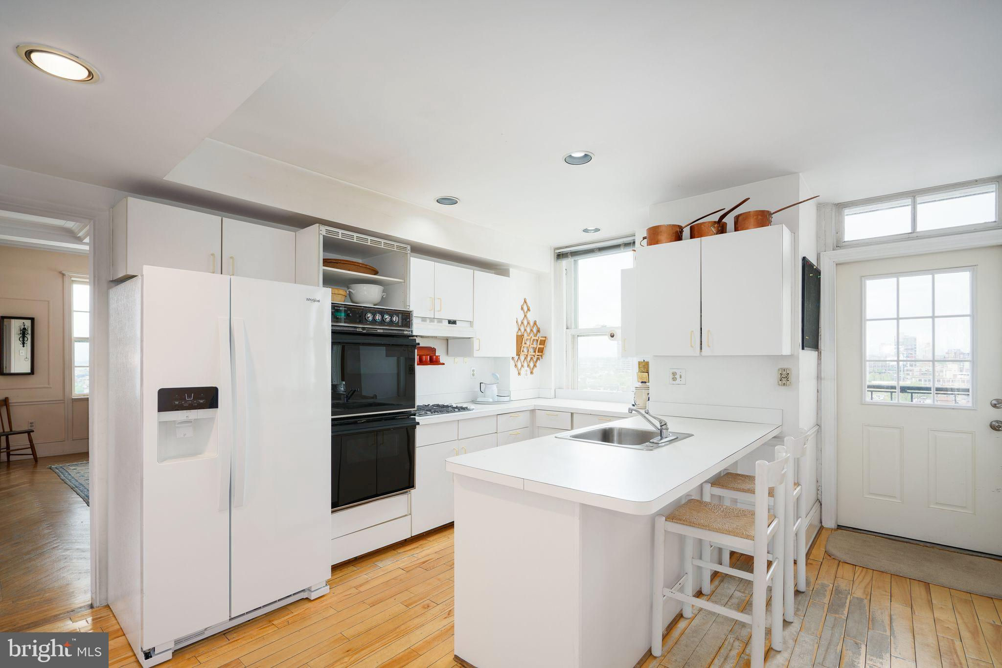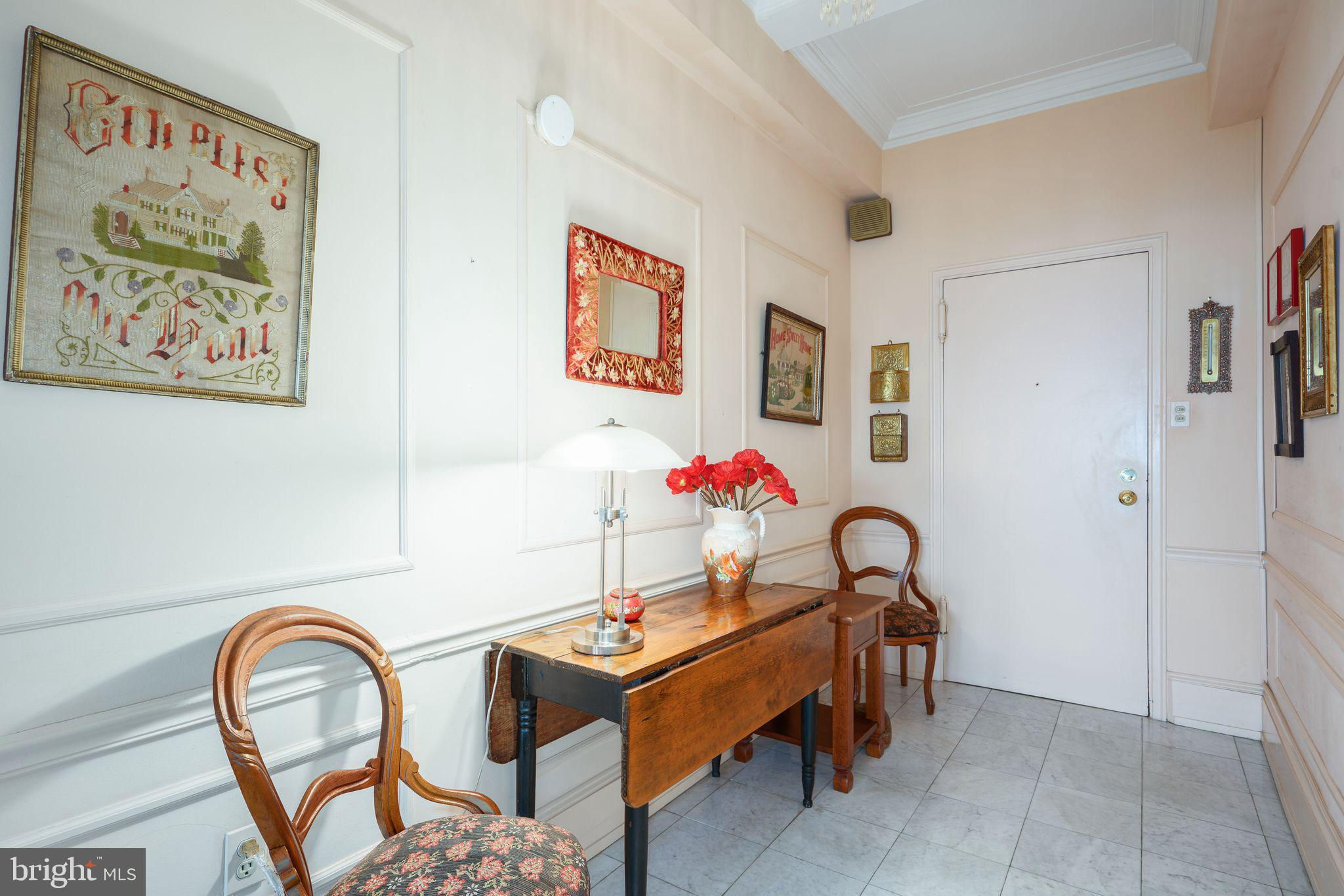 This beautiful 2,197 square foot 12th floor pre-war apartment feels like HOME. Enter pretty foyer with large coat closet, chandelier and marble floors. Spacious and bright living room with herringbone wood floors and crown moulding open to beautifully appointed formal dining room with windows facing South and West. Door to large eat-in-kitchen with ample cabinetry, China closet and door to sunny terrace. Hallway with door to large laundry room and powder room. Primary bedroom suite features sitting room with built-in millwork bookshelves and desk, closet bar and pocket doors to bedroom. Large walk-in-closet and bathroom with stall shower and marble wainscoting. Spacious 2nd bedroom with en-suite bath with marble floor and tiled tub/shower. 1900 Rittenhouse Square is a boutique building with 24-hour doorman, steps from restaurants, shops and all Rittenhouse Square has to offer.