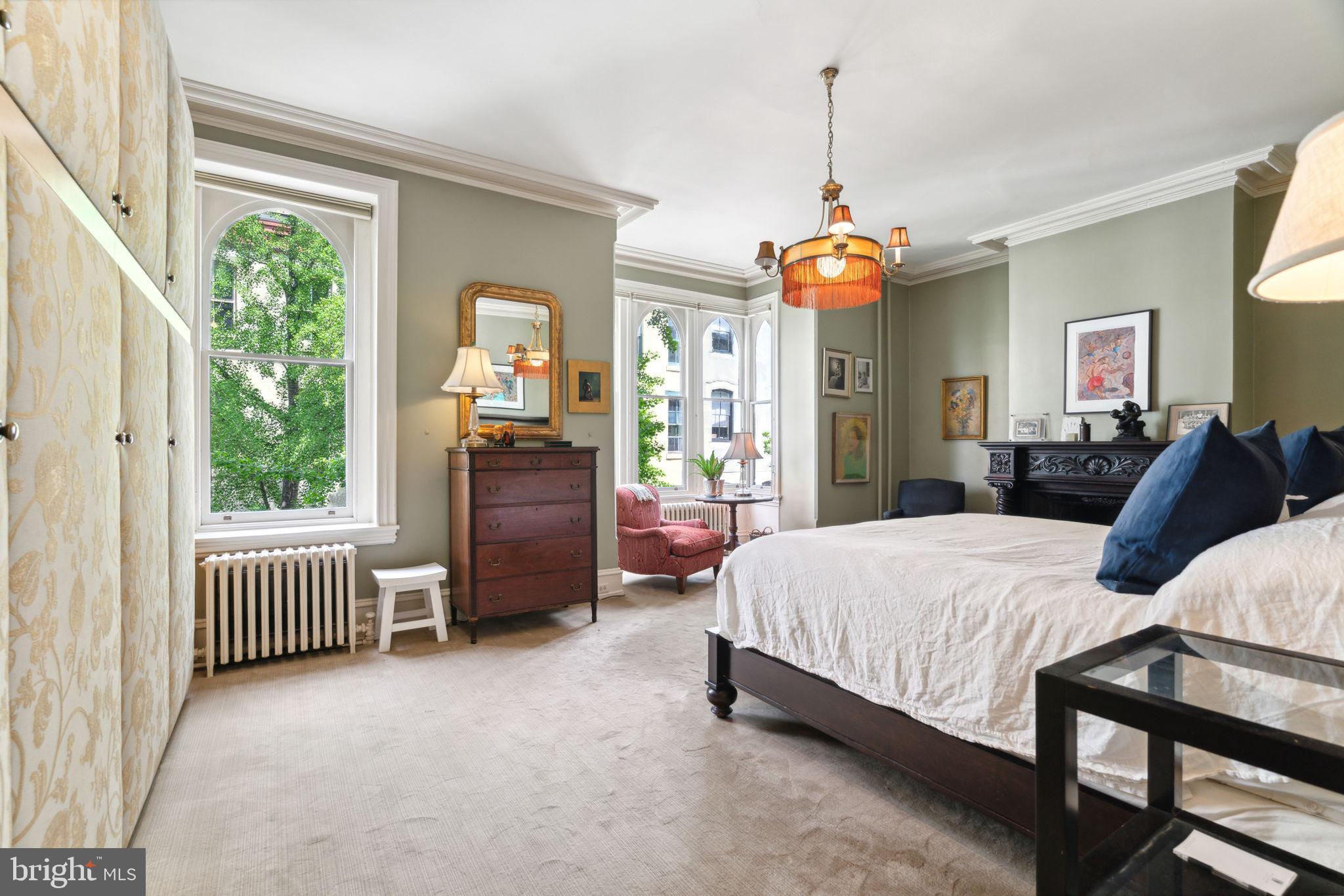 Magnificent high-Victorian Rittenhouse Manse with expansive 25’ frontage, 4 stories plus walk out lower level to a lush rear garden. This Venetian Gothic townhouse features a marble & limestone facade with arching windows and oriel bay overlooking St James street, one of the neighborhood's iconic blocks, lined with immaculately preserved homes by Furness & other notable 19th c. architects. A previous rooming house until the current owners totally restored it to single family use with noted architect & former AIA President, Susan Maxman. 10 bedrooms, 4 1/2 baths, 6 fireplaces, and over 5000 sf of living space this gracious home accommodates family & guests alike plus offers many additional uses; home office, painting studio, sitting room etc. 11’ high ceilings throughout are crowned by original plaster mouldings and architectonic details abound from intricately carved mantles to a central wraparound staircase surmounted with skylight, illuminating the center of the home. Enter the home through double doors flanking a walnut paneled vestibule, a weather break from the elements. The main level offers formal living room with decorative, carved marble fireplace, white oak herringbone floors and gallery lighting to highlight your art collection. The dining room connects from both the main hall or through a passage under the stair and is the ideal space for sumptuous dinner parties or intimate family gatherings. High ceilings, an original carved wood fireplace mantle and a deep bay window overlook the garden. The home’s "NY Loft" kitchen is a study in modern style and restraint, part of a second renovation by architect Spence Kass. Warm rift-cut mahogany cabinetry contrasts with cool gray quartz counters and frosted glass backsplash. Sleek, stainless Sub-zero and Miele appliances complete the state of the art chef’s kitchen. At the end of the main level an intimate breakfast room with original leaded glass window hovers over the garden, and a set of steps leads down to the back yard sanctuary. Ascend the central wraparound staircase to the primary bedroom level where a 25’ wide room accommodates any size bed, built-in closets, a sitting area in the oriel and a statement-making, turned and carved, decorative wood mantel. Walk-through closets join the bedroom to a private sitting room which connects to the spa-like primary bath, making this floor your private suite of rooms. The bathroom offers separate soaking tub & shower, water closet and pedestal sink. The 3rd floor has a group of 4 bedrooms and 2 baths, both rendered in original porcelain subway tiles, one features a vintage soaking tub. Two of the bedrooms serve alternative purposes, one, a sitting room and the other has been transformed into a deluxe laundry space. The home’s top floor has 4 more bedrooms and newly renovated hall bath with glass enclosed shower. The largest of the bedrooms is used as a home office, tucked into the south facing bay window. A mixture of original red pine and golden oak hardwoods cover the home’s upper floors. The lower level, originally the home’s kitchen, has direct access to both the rear garden & the street in front under the stairs (perfect for bringing bikes in from outside). Currently used as an artist’s studio, this level also makes an excellent den, playroom or workout space. Located in the award-winning Greenfield School catchment and equidistant to Rittenhouse & Fitler Squares and the miles-long Schuylkill Banks river trail, this home rests in the middle of a low-traffic, tree-lined street. Sellers will pay for a year’s parking at a nearby garage, steps from the house. Near incredible shopping on Walnut & Chestnut Streets and some of the city’s best restaurants, Vernick, Parc, Wilder and so many more. With easy access to 30th St station, Penn, Drexel, CHOP, HUP and the downtown business core - this outstanding home offers everything that makes urban living so incredible. See this stunning home today!