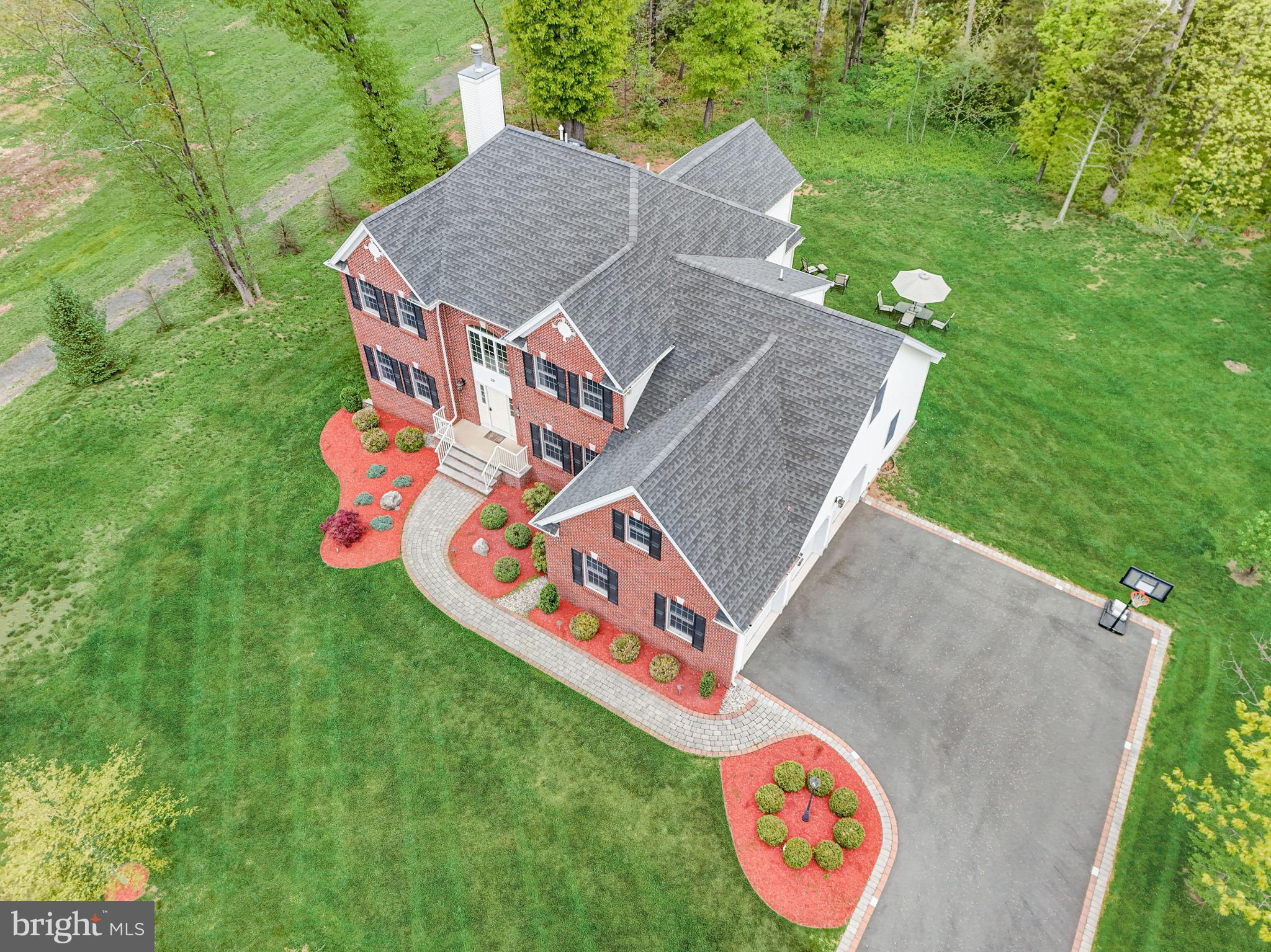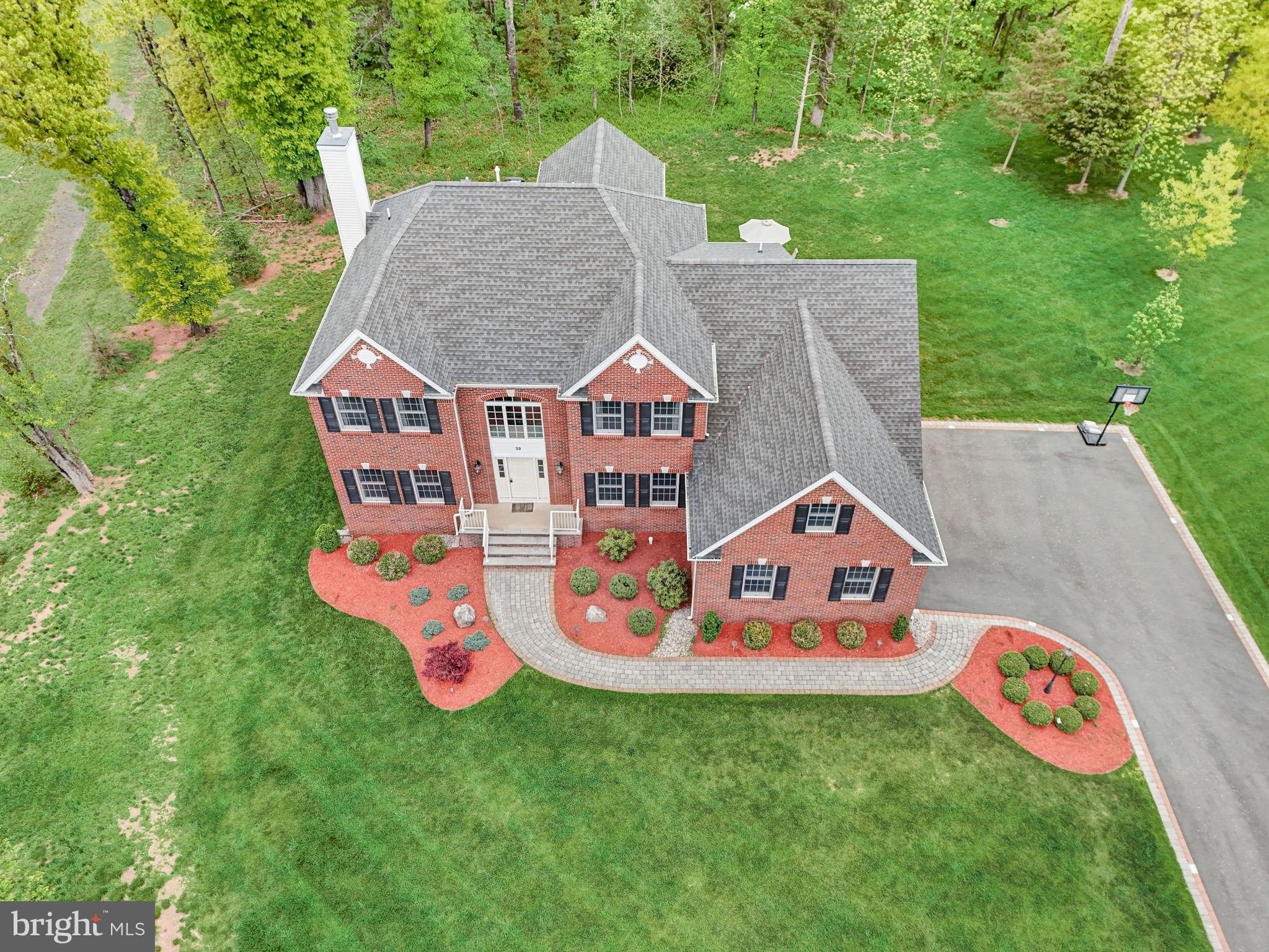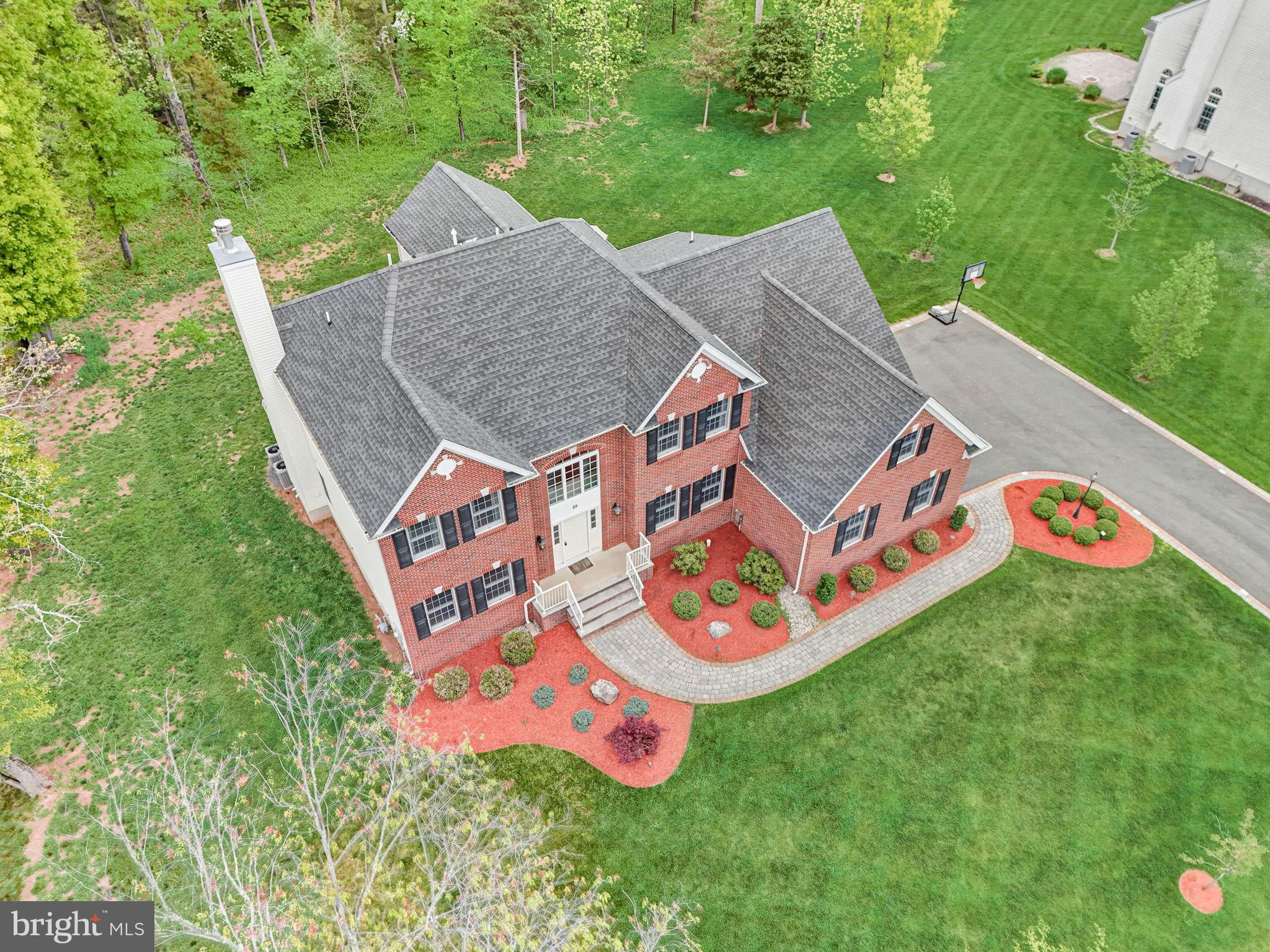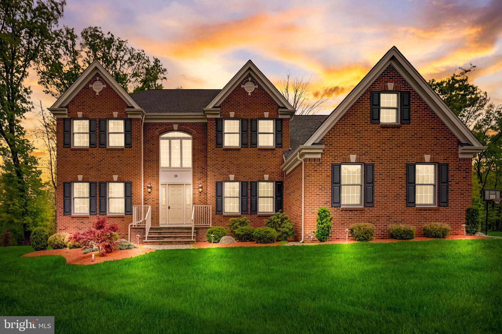 Beautifully Appointed Home with Highly Acclaimed Montgomery Twp Schools! Situated on a quiet street that ends in a cul de sac, 29 Twin Brook Drive enjoys a wonderful location backing to woods and beside a retention basin, affording the home a good deal of privacy. The stately brick facade is nicely accented by the inlaid brick driveway which leads to the thee-car side entry garage, and a paver brick walkway leading to the front door. Enter this nearly-new home (built in 2017) to a roomy and gracious two-story foyer. Hardwood floors and neutral tones carry throughout the main level, creating cohesion in the open floor plan from room to room. The formal living room and dining room flank the foyer. The living room opens to the family room, while the dining room opens to the kitchen, providing seamless flow throughout the main level, ideal for entertaining. A fireplace between two arch-top windows overlooking the open space beside the home provides a lovely focal point to the family room. A knee wall strikes just the right balance between open concept and definition between family room and kitchen. The chef’s kitchen has a center island with seating and storage, granite countertops, upgraded stainless steel appliances and a separate breakfast room in a sunny corner with windows and sliding glass doors providing views and access to the backyard. A main floor study is near a full bath, creating the option to serve as an office, guest suite or fifth bedroom. The mud / laundry room with utility sink completes the main level. The second level hosts the spacious primary suite, a second en suite bedroom with its own bath, and two additional bedrooms that share a hall bath. The primary bedroom has a tray ceiling, two walk-in closets and a sitting room that could be used for an additional office space, a nursery, or exercise room. The unfinished basement has high ceilings. Enjoy the convenience of public utilities.