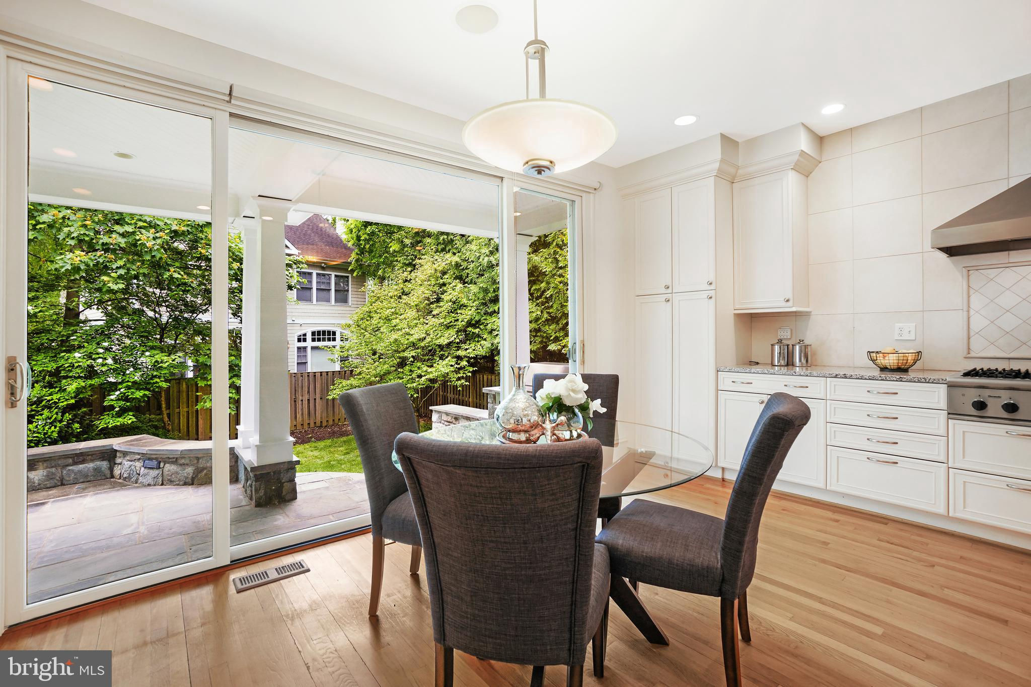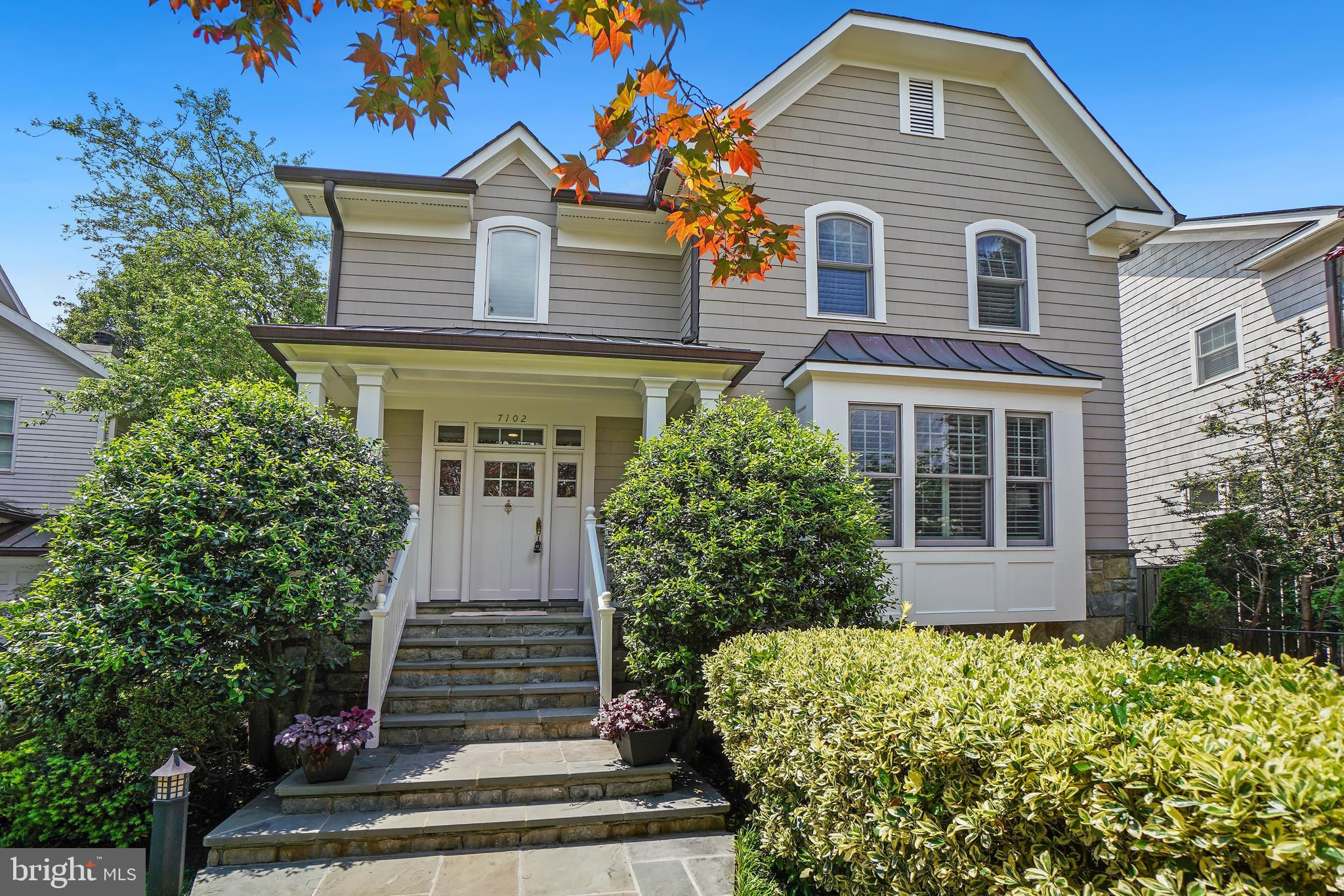 Four levels of fabulous just two blocks from all the downtown Bethesda has to offer. Welcome to 7102 Exeter Road a Stunning Craftsman style house built in 2000. Step inside the front door and notice the stunning hardwood floors throughout the main level. Immediately to your right, you will discover the study that includes custom built-in desk and book shelves. Next, you will find the banquet-sized dining room, the perfect place to entertain. The back of the house includes a chef's dream kitchen complete with high-end appliances, a large island, table space, a beautiful view of the backyard, and a covered flagstone patio. The family room is adjacent to the kitchen and has a gas fireplace and custom built-ins. The second level hosts the primary bedroom suite with a super sized walk in closet and a spa inspired bath. There are two additional bedrooms on this level each with an en-suite baths. The fourth floor makes either the perfect guest suite with an en-suite bath and a mini refrigerator and microwave. The lower level is where you will find the media room, a rec room, a full bath, a safe room and the two car garage. with extra storage space. The special features, custom touches combined with a wonderful location make 7102 Exeter Road a home your family will treasure.