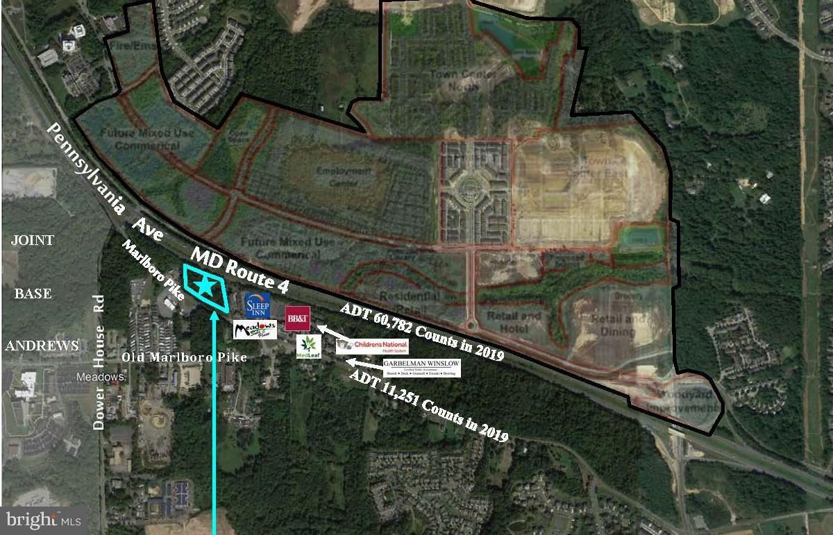 Attention Developers! Approx. 4.8 acres spanning the area between Pennsylvania Ave (MD Rt 4) & Marlboro Pike. Located adjacent to hotel & restaurant, small grocery store, bank, Church, and many professional offices: Pediatricians, Optometrists, Accountants, Dentists, and more. Great visibility with high traffic count, and SO much potential! Currently zoned CSC, and will to change to CGO on 4-1-2022, which permits Car Wash, Self-Storage, Retail businesses, Office use, Multi-Family & much more. Neighborhood is expanding and there are future plans in place to accommodate influx of residential population. Don’t miss this opportunity.